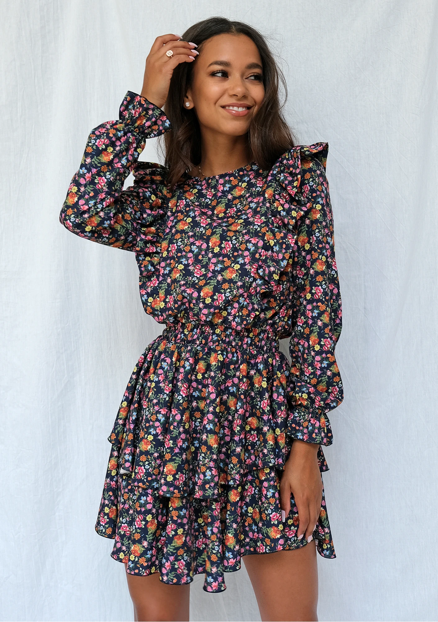 Na taką sukienkę trudno nie zwrócić uwagi! Przyciąga spojrzenie nie tylko bardzo oryginalnym fasonem, ale i motywem, który od razu rzuca się w oczy. Drobna łączka jest przede wszystkim bardzo dziewczęca, a taki motyw sprawdzi się nawet w przypadku sukienki na wesele. Jej najmodniejszym elementem, z całą pewnością są mocno zarysowane ramiona. Takie fasony w tym sezonie królują na wybiegach modowych. Do tego dochodzi dopasowanie w talii, falbaniasty dół o asymetrycznym kroju oraz długie rękawy. Dzięki temu jest to, zarówno sukienka na lato, jak i na wczesną jesień. Sama w sobie ma niebieską bazę, ale kwiatki są wielokolorowe, co cudownie kontrastuje z całością. Z tyłu zapinana jest na niewielki guzik na karku. Sukienka wykonana jest z poliestru oraz laycry. Dostać ją można w czterech rozmiarach XS, S, M oraz L. Wszystkie nasze produkty powstają w Polsce, dzięki czemu lepiej można kontrolować ich wykonanie oraz jakość.