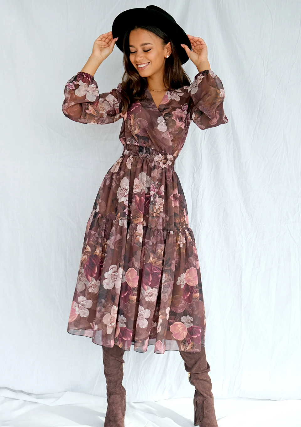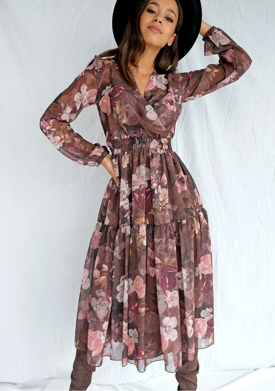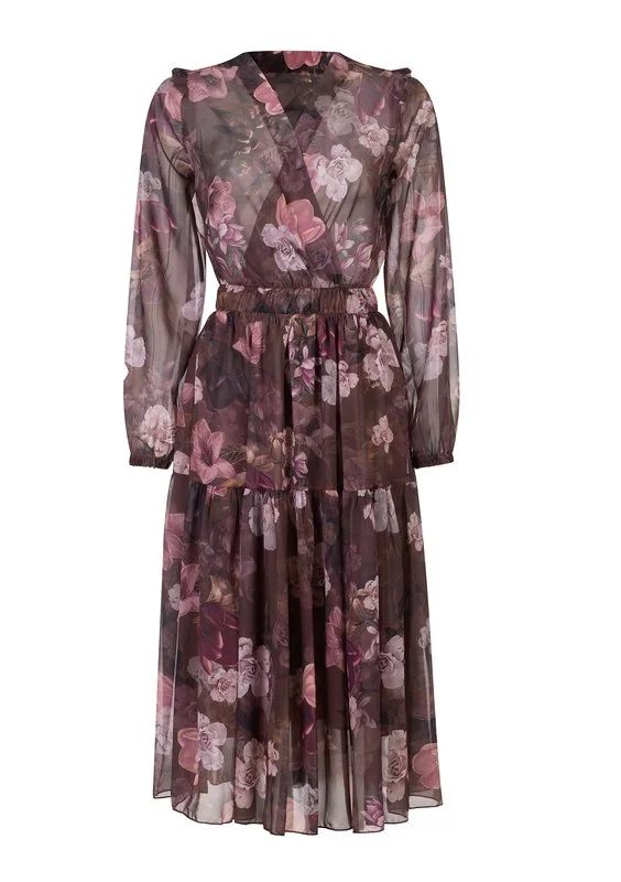 Maya - Szyfonowa sukienka midi w kwiaty Brązowa