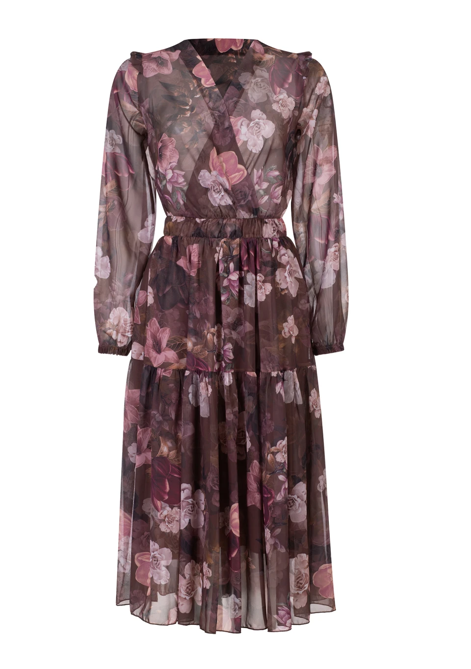 Elegancka sukienka midi z szyfonu w jesiennej kolorystyce brązu. Kreacja romantycznie dopełniona kwiatowym printem. Prezentuje się bardzo lekko i kobieco, za sprawą kopertowego dekoltu i rozkloszowanej formy z przeszyciem. Odpowiednia na oficjalne spotkania, jak i bez okazji.
