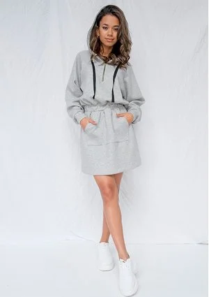 Dzianinowa sukienka damska zatroszczy się o kobiecy wygląd figury. Szeroki pas w talii ma za zadanie podkreślić naturalne wcięcie sylwetki, dbając o zachowanie prawidłowych proporcji ciała. Góra ubrania przypomina klasyczną bluzę. Ma głęboki kaptur i długie rękawy, wykończone ściągaczami w nadgarstkach. Pod szyją znajduje się ozdobny zamek, z kolei kaptur wykończony jest sznurkami w kolorze czarnym. Kontrastujące z szarym odcieniem tkaniny dodatki są widoczne z daleka i dobrze wpisują się w sportowy styl ubrania.