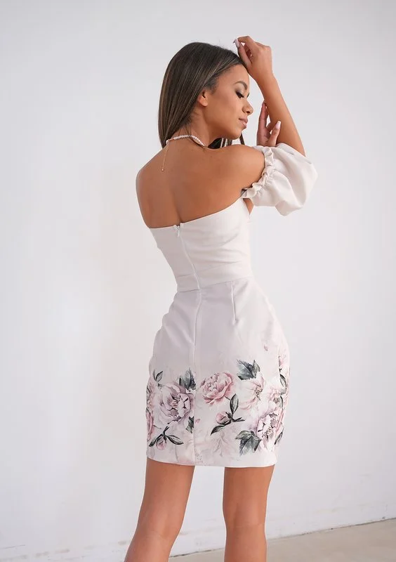 Zmysłowa sukienki mini o gorsetowym, dopasowanym fasonie. Pięknie wyeksponuje dekolt, ramiona, plecy oraz nogi. Delikatny i kobiecy efekt współtworzą obniżone rękawki i romantyczny, kwiatowy motyw.