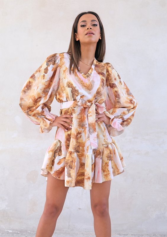 Angela - Sukienka z paskiem w akwarelowy wzór
