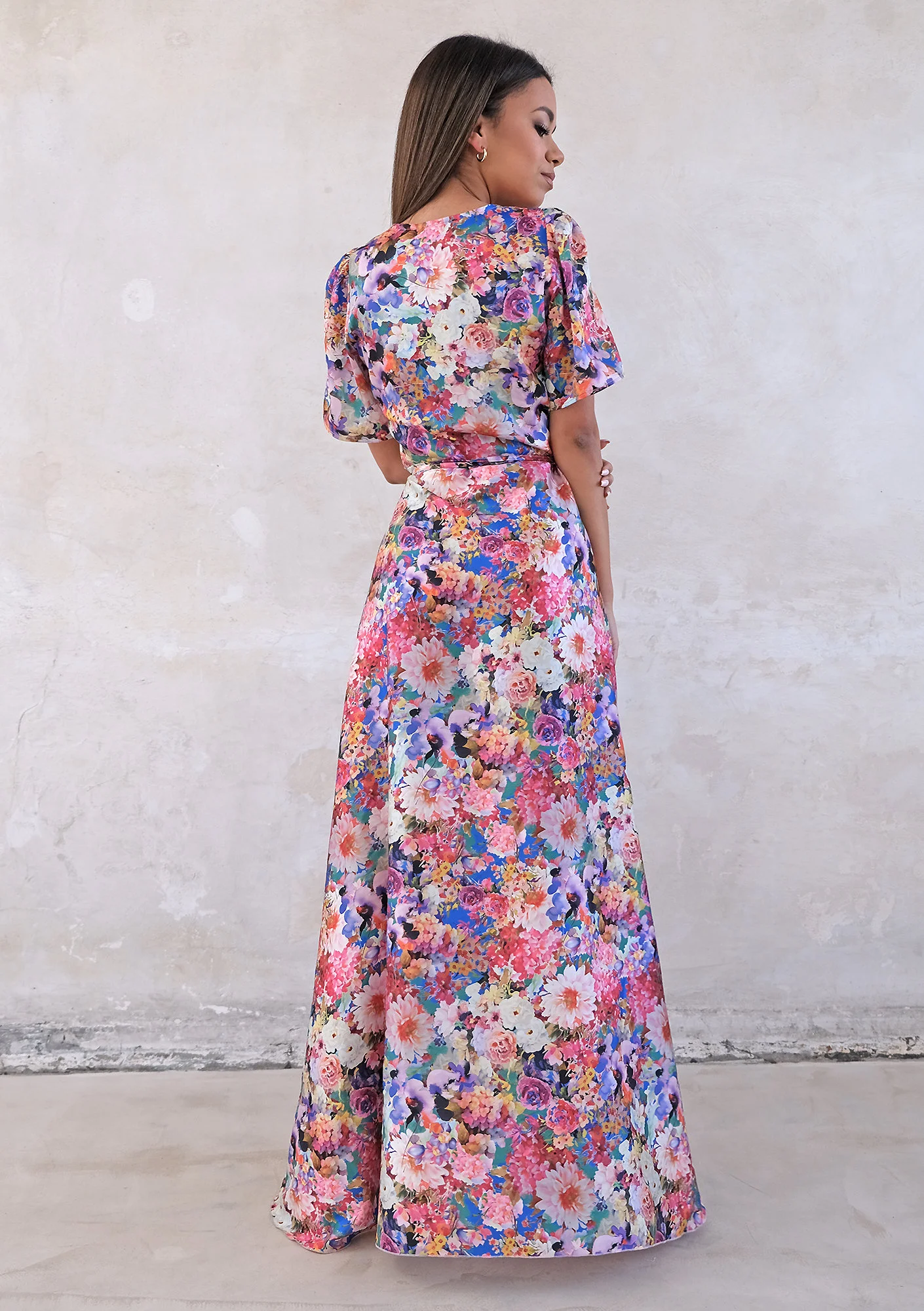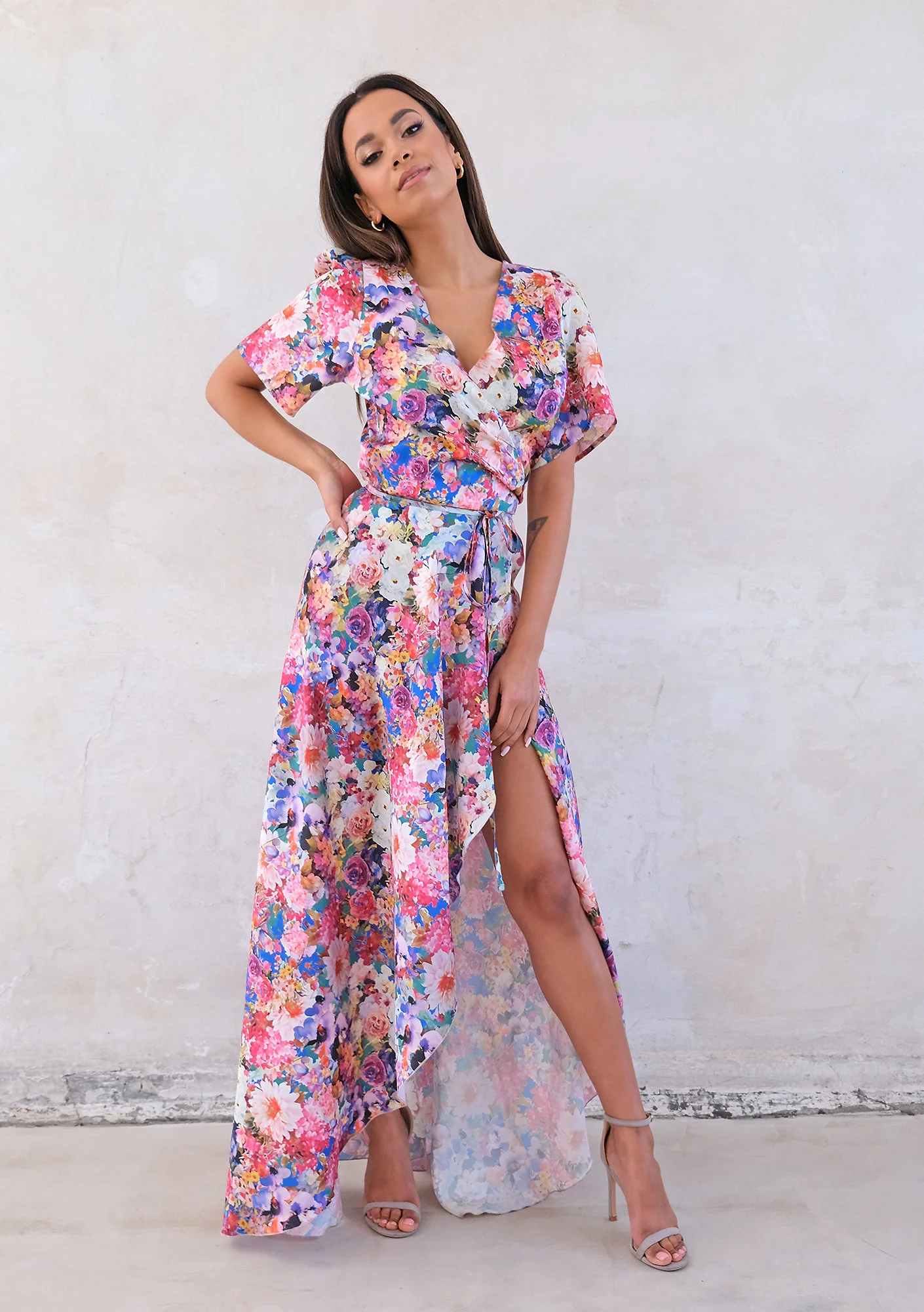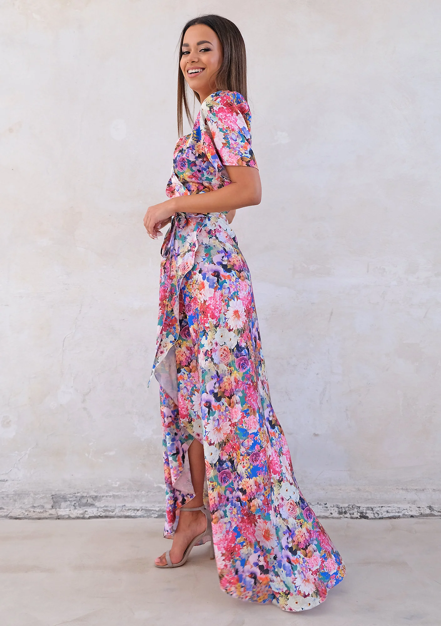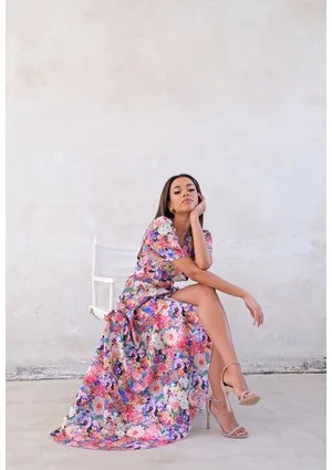 Zgłoś nielegalną treśćPiękna sukienka w kolorowe kwiaty o długości maxi sprawi, iż przyciągniesz każde spojrzenie. Zniewalająca moc wyrazistego, wielokolorowego deseniu oraz efektowne odsłonięcie nogi Alicja Komar proponuje kobietom, które nie mają oporów, by wyglądać oszałamiająco. Letnia sukienka maxi w kwiecisty wzór doskonale otworzy sezon wiosenno – letni, gdy chcemy wreszcie zrzucić grube swetry i płaszcze oraz rozpocząć wspaniały czas słonecznego ciepła, wakacji i spędzania więcej chwil z przyjaciółmi. Sukienka w kwiaty to wspaniała kreacja także na randkę oraz przyjęcia okolicznościowe, takie jak wesele, komunia i imprezy urodzinowe. Lekkość kopertowego fasonu sukienki został osiągnięty tu za sprawą równego cięcia materiału, który tworzy piękną falę zmysłowo odsłaniającą nogi. Dekolt w kształcie litery V oraz tasiemka zwężająca sukienkę w talii podkreślają kobiece atuty, a rękawy do połowy ramion równoważą stylizację.