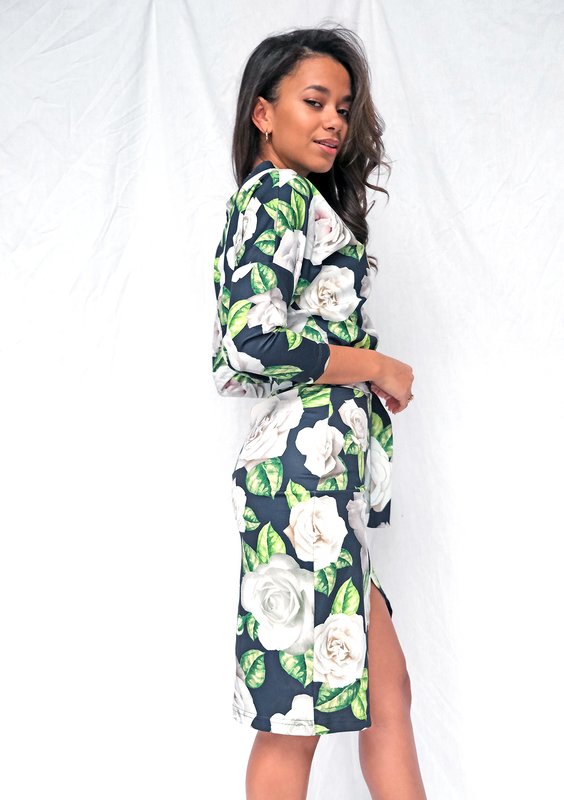 Elegancka sukienka midi o wzorze białych róż, ozdobiona kopertowym krojem dolnej części i wiązaniem. Wykonana z wygodnej, elastycznej tkaniny.