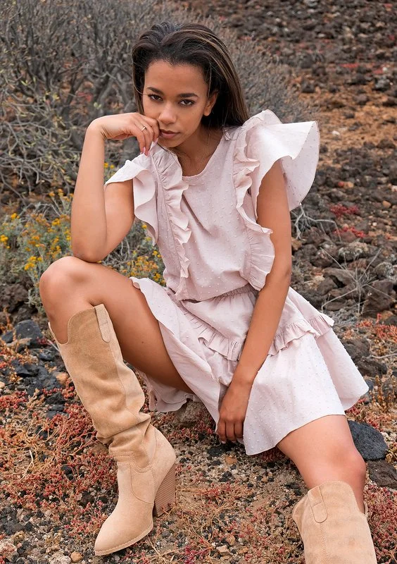 Beżowa sukienka mini ozdobiona falbankami i delikatną, nakrapianą fakturą tkaniny. Szyta z przewiewnej bawełny, idealna na słoneczne dni.
