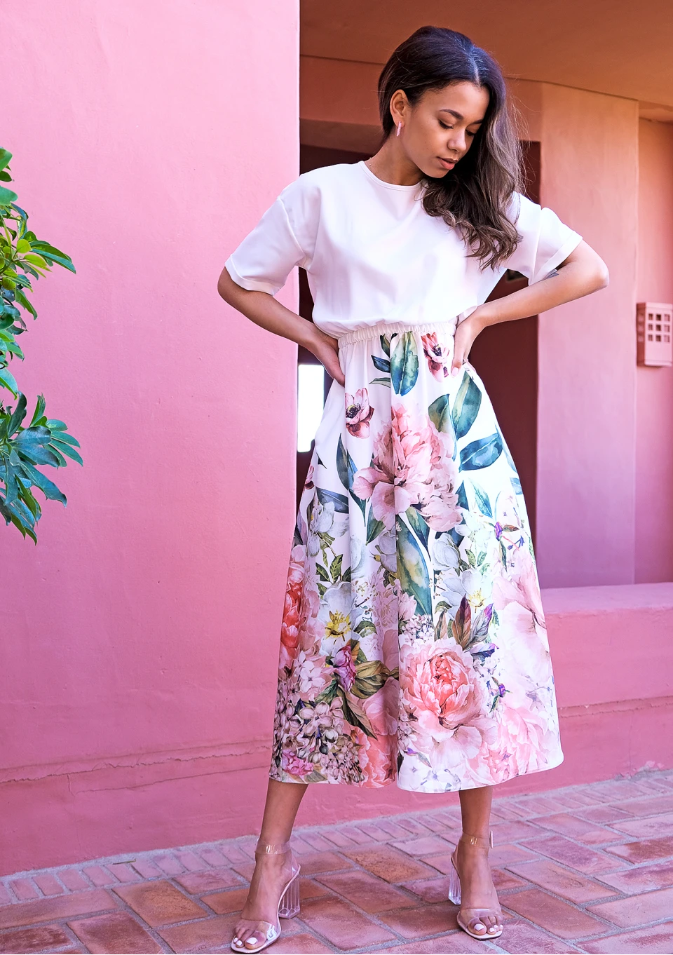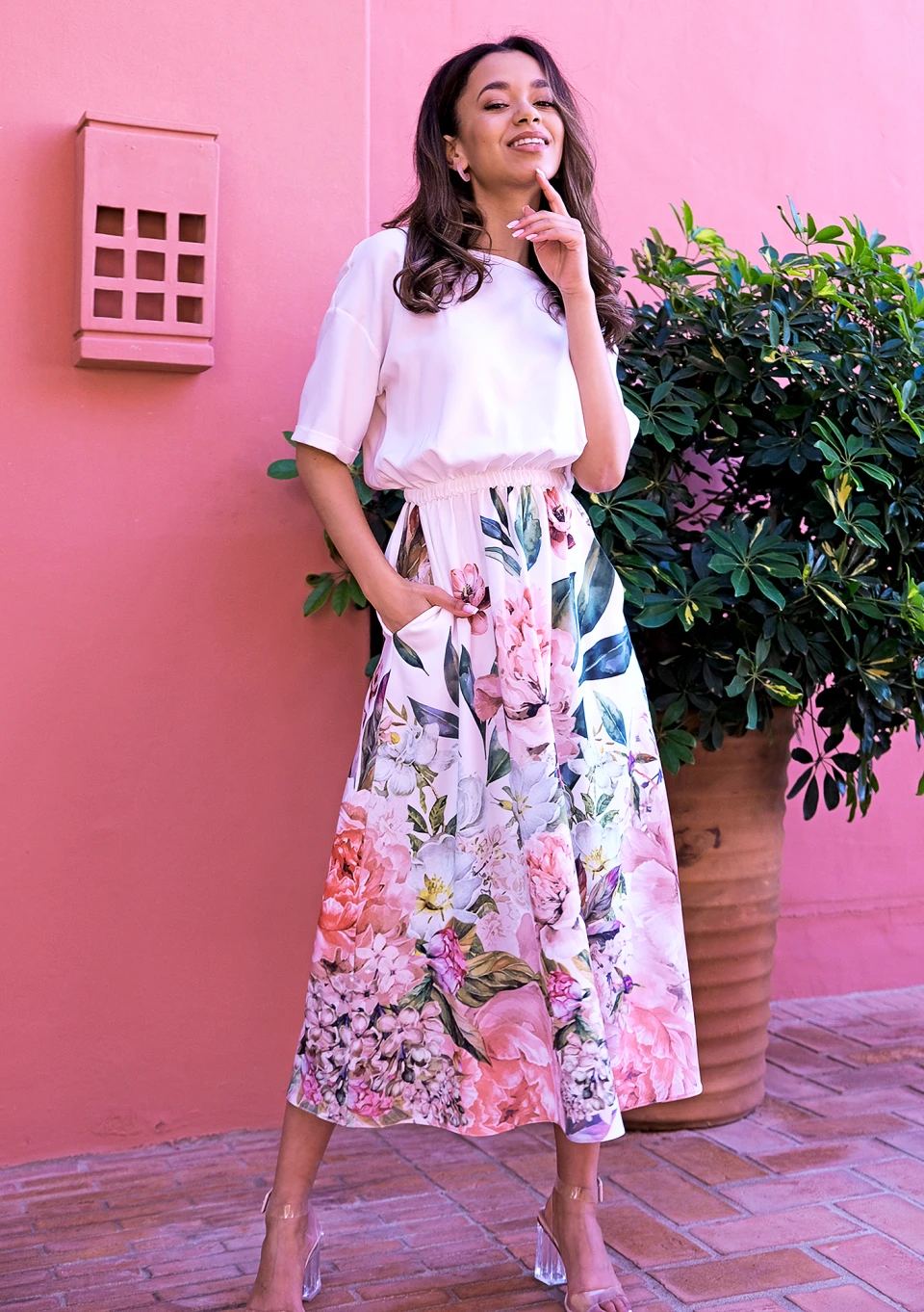 Niezwykle wygodna, a zarazem elegancka sukienka o czarującym wzorze kwiatów. Luźny krój z gumką w talii sprawia, że każda sylwetka prezentuje się w nim rewelacyjnie. To kreacja w odcieniu ecru, wykonana z komfortowej i niegniotącej się tkaniny.