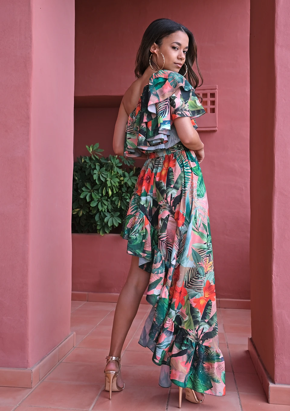 Fason maxi, z asymetrycznym dołem i na jedno ramię, ozdobiony falbanami w hiszpańskim stylu. Sukienka posiada elastyczną gumkę w talii.