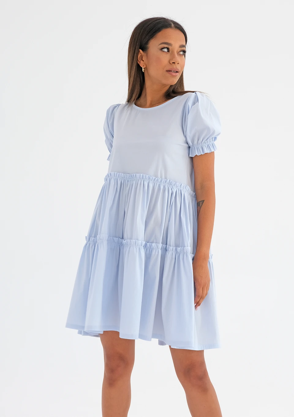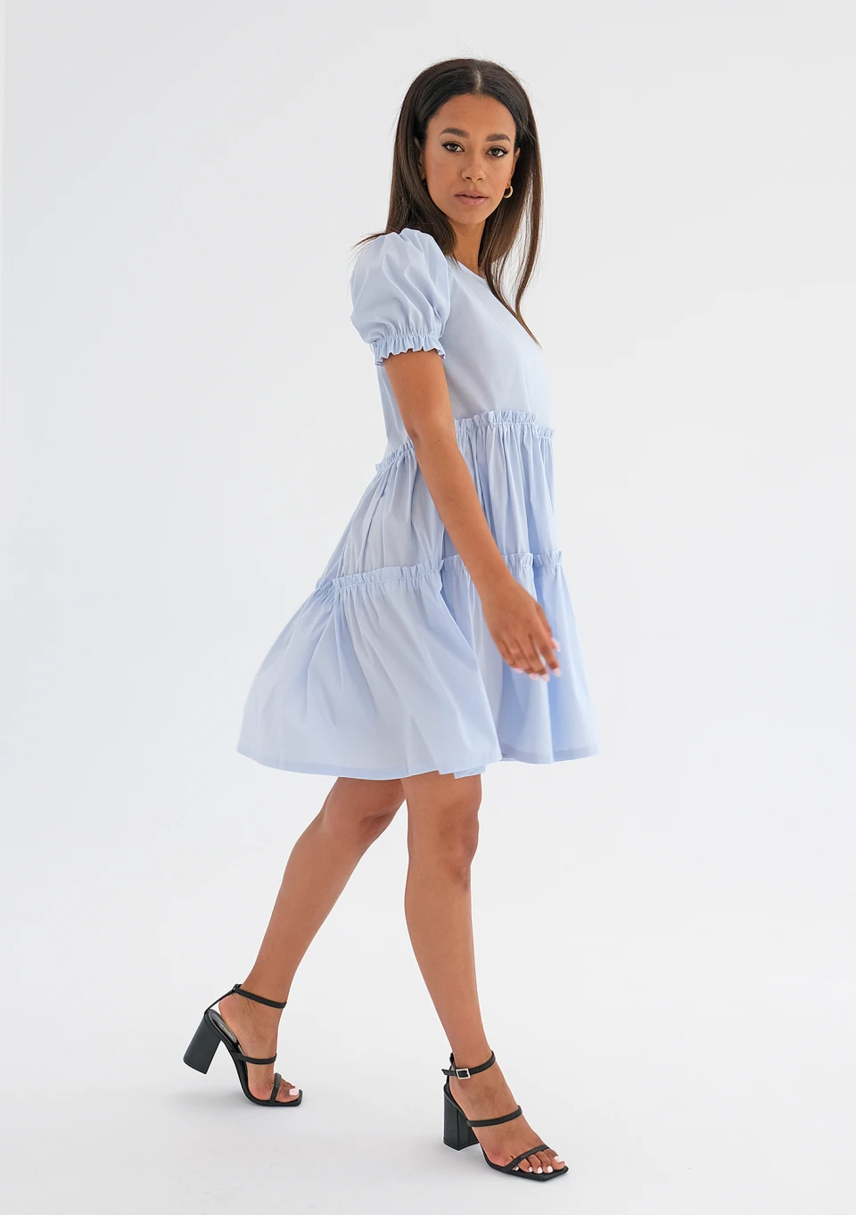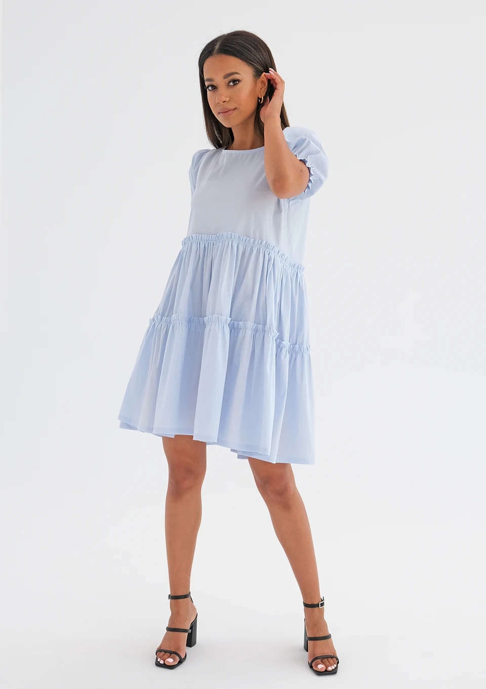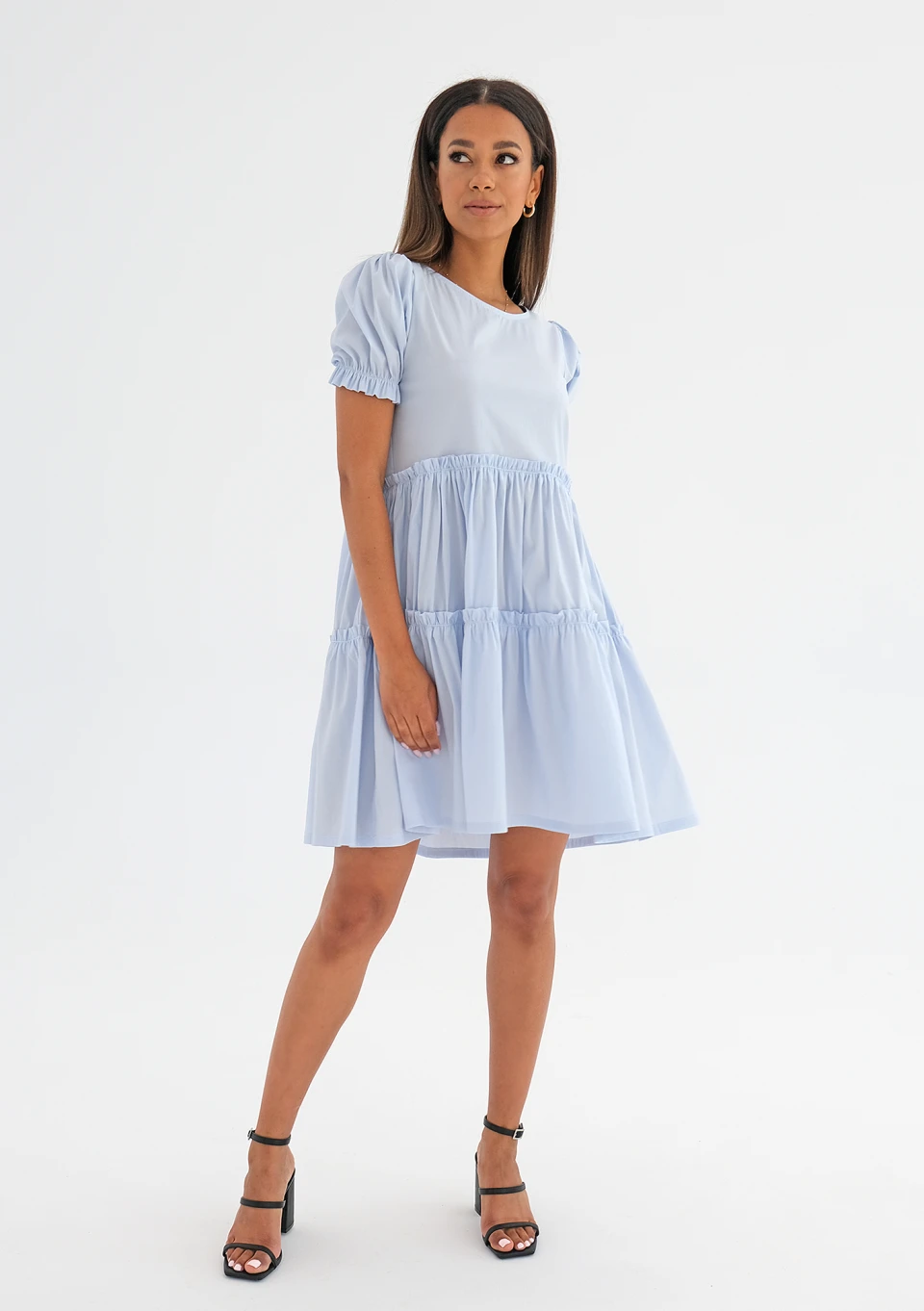 Niezwykle subtelna sukienka mini dla romantycznej duszy. Oczarowuje delikatnością fasonu, ozdobionego falbankami. Wykonana z lekkiej bawełny, idealna na letni sezon.
