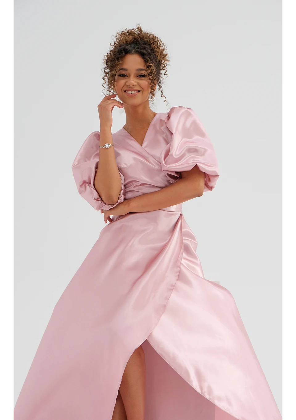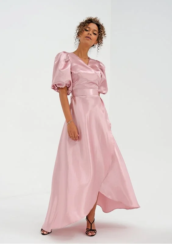 Wieczorowa sukienka maxi z luksusowym połyskiem satyny i dekoracyjnymi bufkami, które budują pełen finezji, romantyczny styl. Delikatna i subtelna, a zarazem bardzo elegancka. Idealna na szczególne uroczystości.