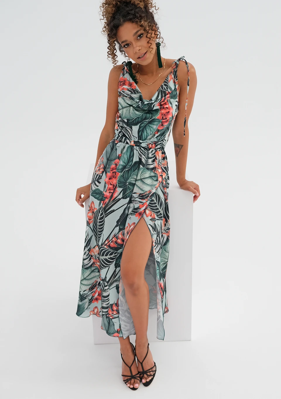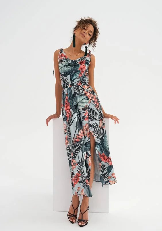 Eteryczna sukienka midi o rajskim wzorze egzotycznej roślinności. Dekolt o kroju typu woda, odsłonięcia ramion i nogi zadbają o zmysłowy efekt. Sukienka ma wiązane ramiączka i elastyczną gumkę w talii oraz zakładkowy krój dołu.