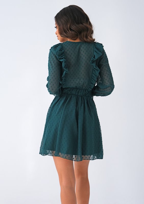 Zielona sukienka mini ze zwiewnego, półprzezroczystego szyfonu. Finezji dodają jej subtelne falbanki, kopertowy dekolt oraz nakrapiana faktura materiału. Sukienka na codzienne, jak i szczególne okazje dla prawdziwej romantyczki.