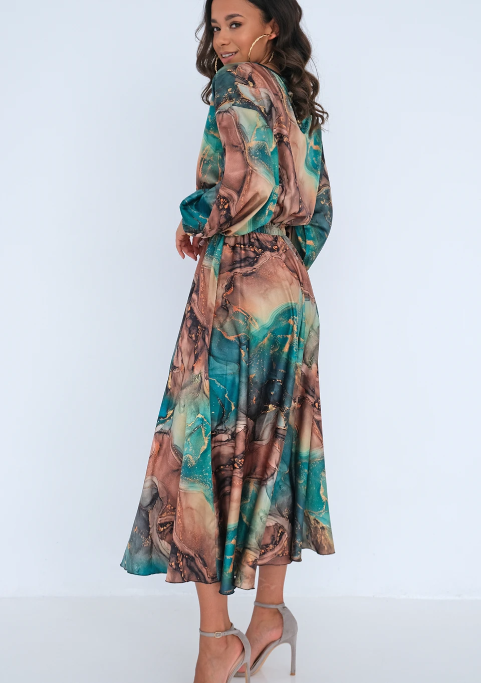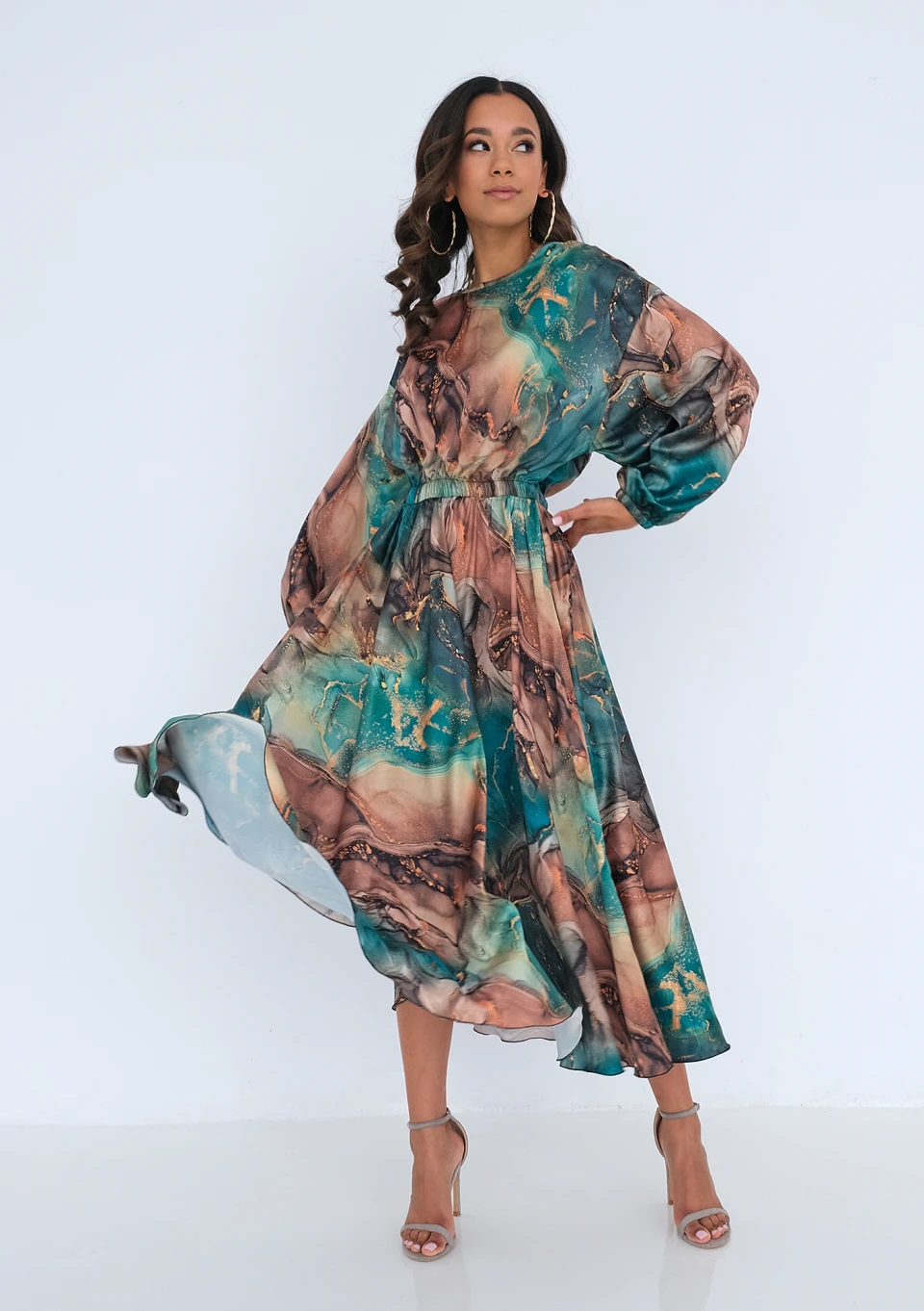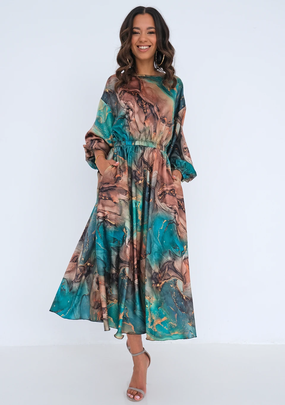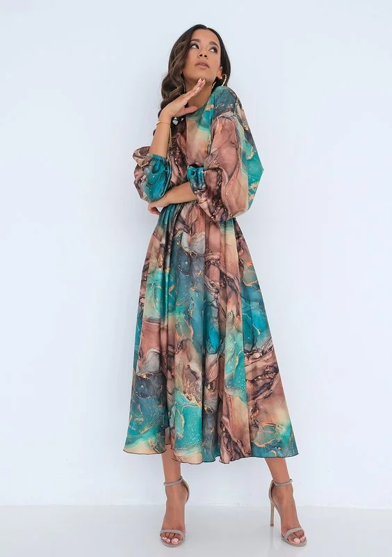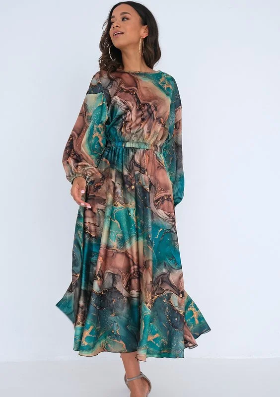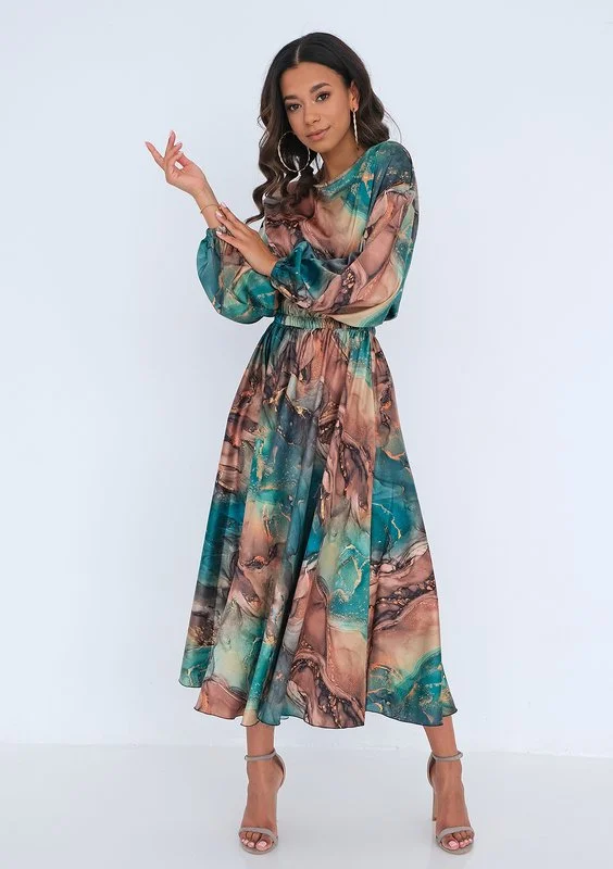 Sukienka midi o wyjątkowym, malowniczym wzorze. Wykonana z eleganckiej i bardzo lekkiej satyny, idealna na ważne uroczystości.