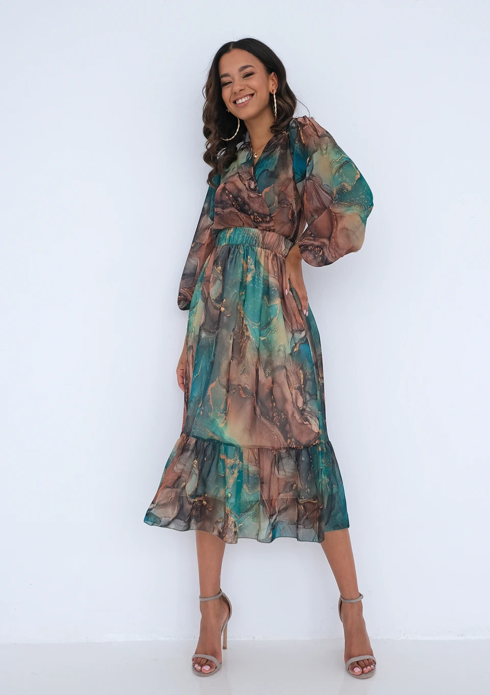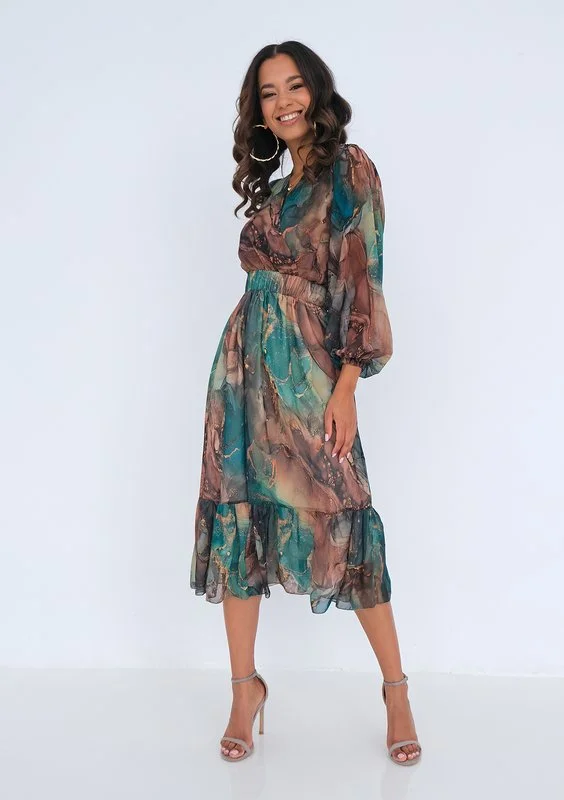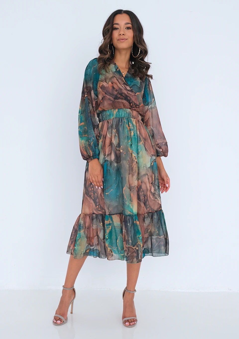 Elegancka sukienka midi o wyjątkowej kolorystyce ciemnej zieleni i brązu, w formie malowniczego mirażu. Zadaje szyku kopertowym dekoltem, falbanką i lekką tkaniną szyfonową.