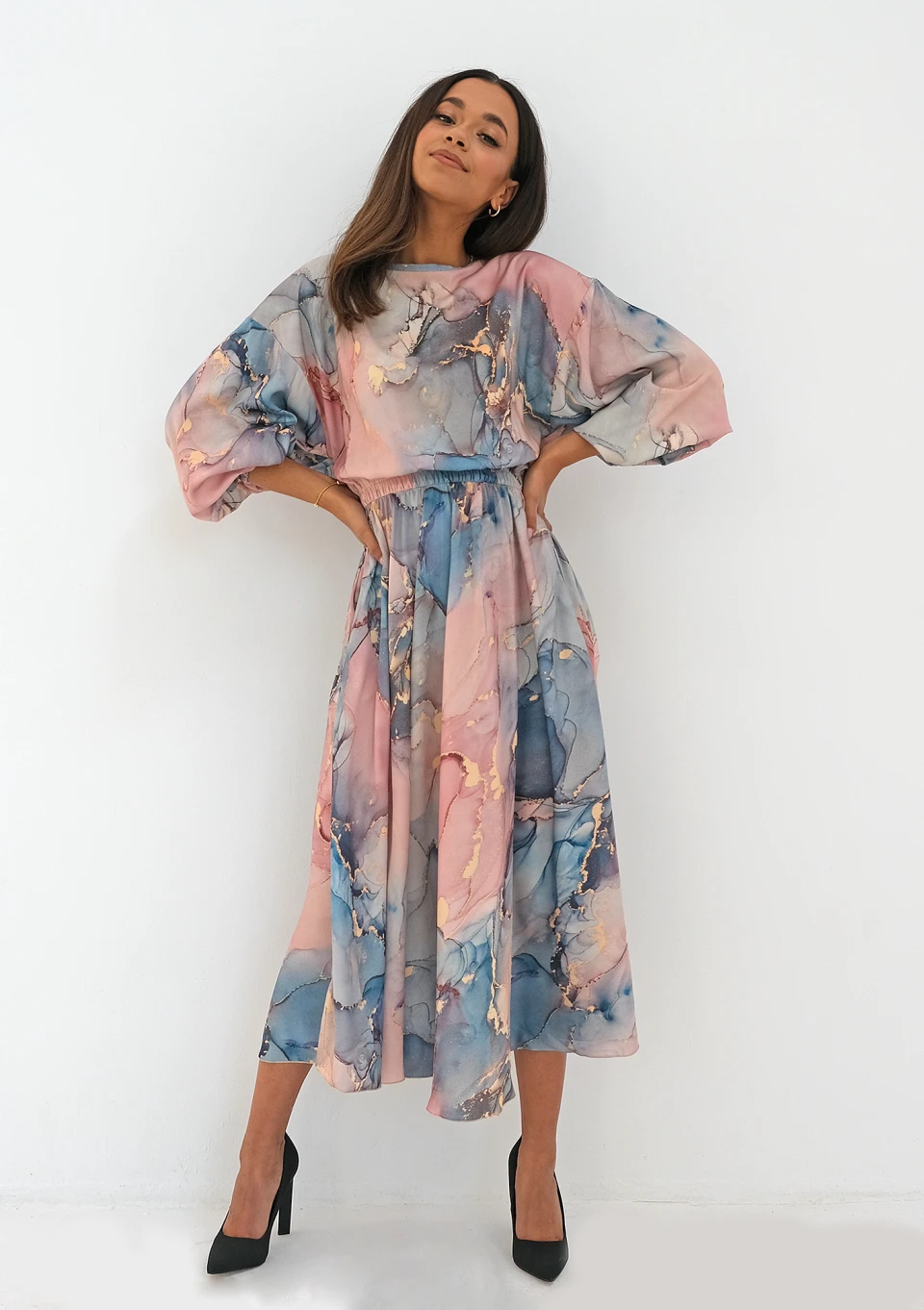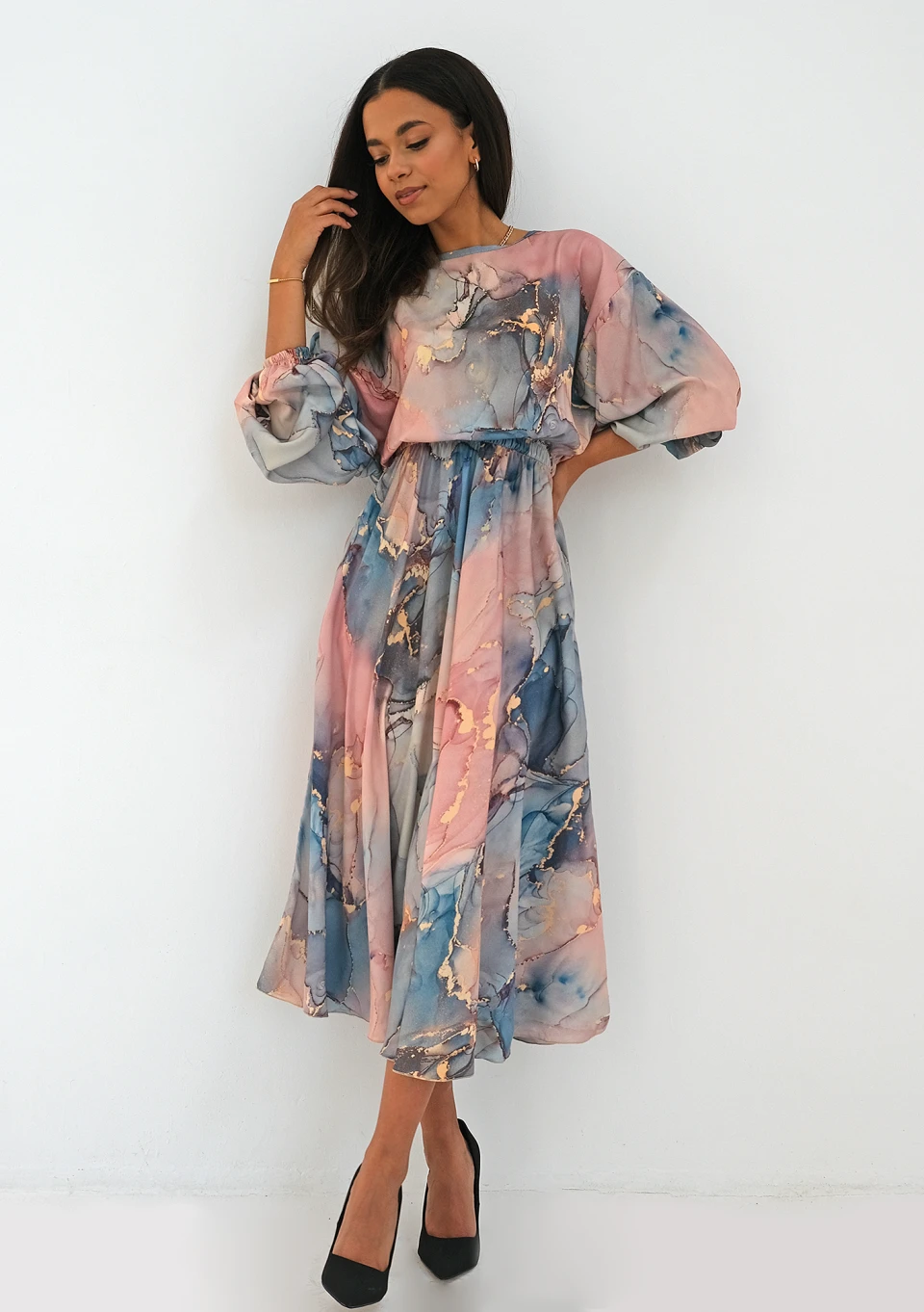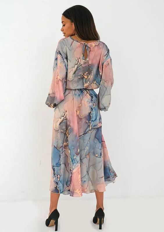Elegancka sukienka o długości midi, wykonana z gładkiej satyny. Idealna na wyjątkowe okazje, wyróżnia się niepospolitą, efektowną kompozycją różowo - niebieskiego wzoru.