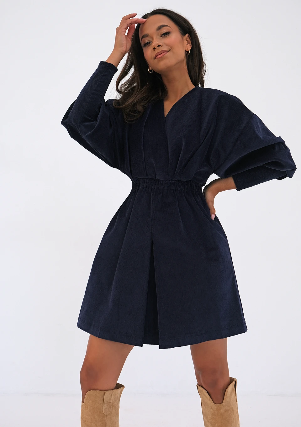 Stylowa sukienka z modnego sztruksu, wykonana w uniwersalnym, granatowym kolorze. Jej ciekawy fason zachwyca luźnymi w ramionach rękawami i szykownym, kopertowym dekoltem. Idealna do wysokich kozaków, jak i botków czy traperów.