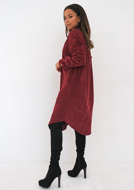 Sukienka koszulowa o bardzo wyrazistym stylu, wykonana z najmodniejszego sztruksu, w kolorze bordo. Zada szyku z wysokimi kozakami, jak i wpisze się w rockowy, zadziorny styl z glanami, traperami i masywnymi botkami.