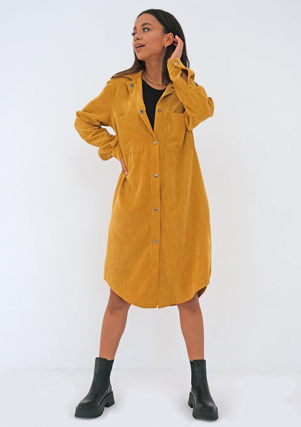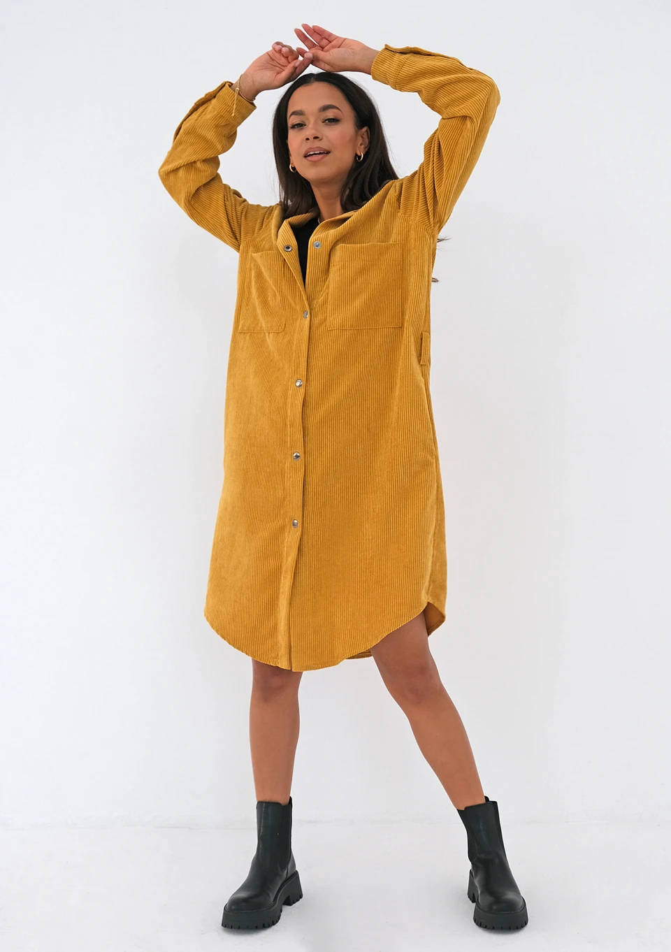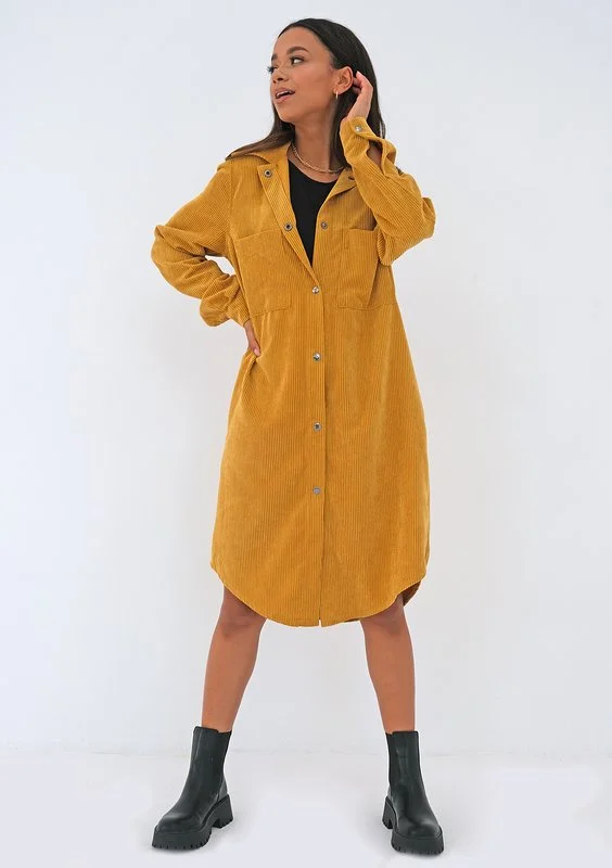 Stylowa sukienka koszulowa, wykonana z najmodniejszego sztruksu, w musztardowym kolorze. Idealna do wysokich kozaków, jak i rockowych stylizacji z traperami i masywnymi botkami.