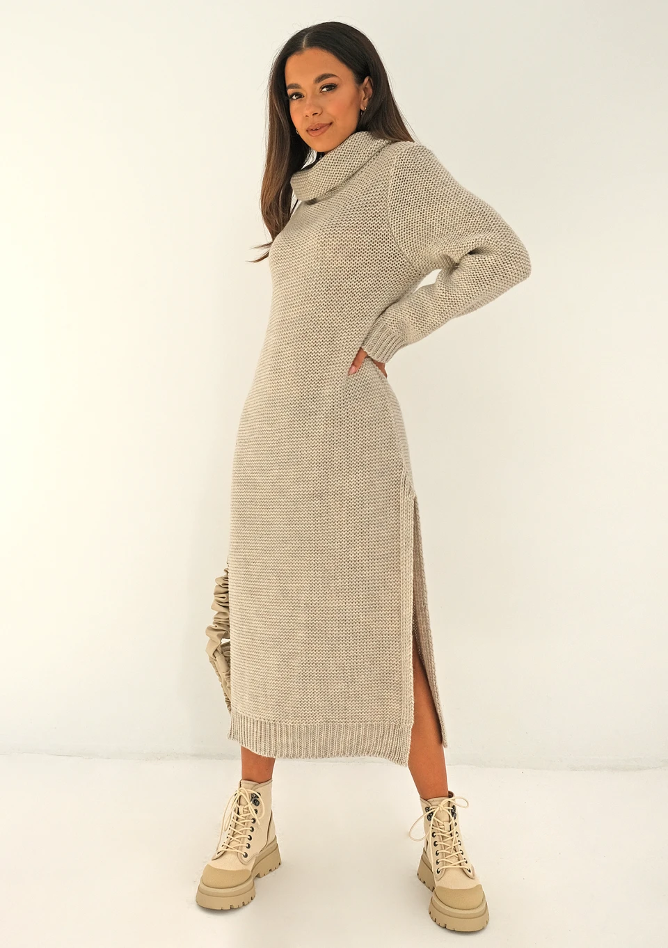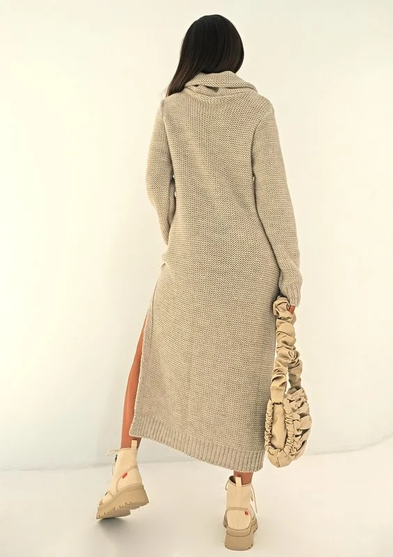 Swetrowa sukienka midi z głębokim, starannie dzianym rozporkiem i szerokim golfem. Obecna w składzie materiału wełna zapewnia wyjątkowo ciepłe otulenie.