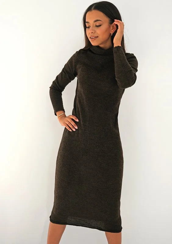 Brązowa, dopasowana sukienka swetrowa midi z drobnym golfem i długimi rękawami. W codziennym ubiorze zapewni łatwy dobór dodatków i delikatny zarys sylwetki. Model wykonany z optymalnie ciepłej i miękkiej w dotyku dzianiny.