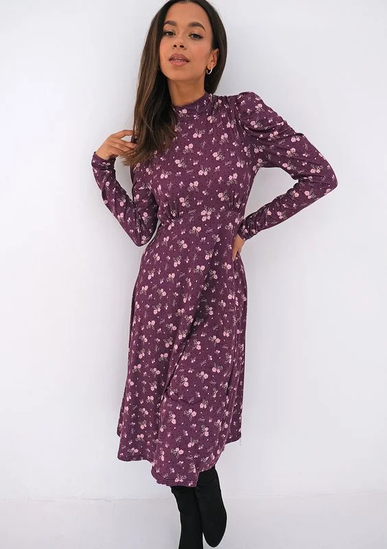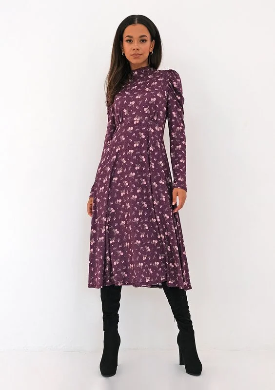 Subtelna sukienka midi wykonana z wygodnej, bardzo elastycznej tkaniny. Model o zabudowanym fasonie, z dekoracyjnymi marszczeniami na rękawach i stójką. Zdobi ją romantyczny wzór drobnych różyczek i groszków.