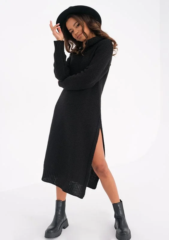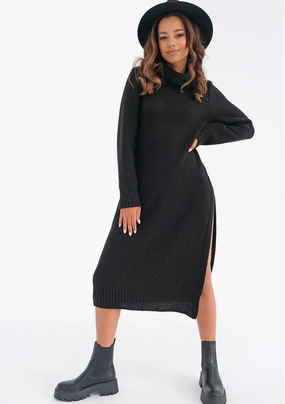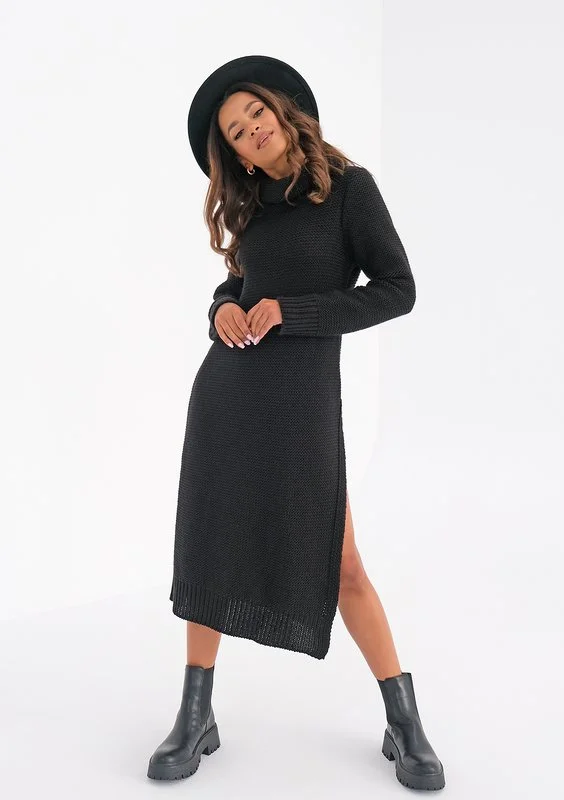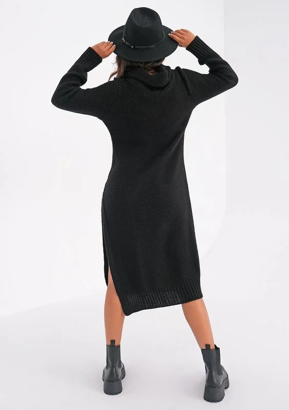 Dzianinowa sukienka midi z głębokim rozporkiem i luźno opadającym golfem. Zawarta w składzie wełna podnosi komfort cieplny, to model idealny na chłodniejsze dni. Wykonana w klasycznej czerni, uniwersalna pod kątem doboru dodatków.