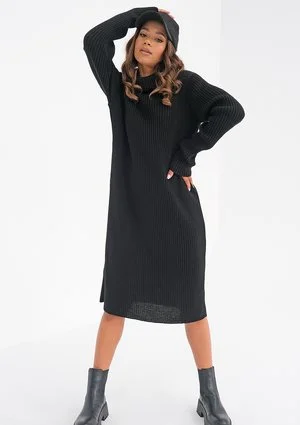 Dzianinowa sukienka midi ma prążkowaną fakturę. Materiał nie podrażnia skóry, nie wywołuje alergii i swędzenia. Sukienka ma zabudowany krój wykończony wygodnym, odpowiednio szerokim golfem. Luźny, klasyczny fason możesz zwężać dowolnie dobranym pasem. Ta czarna sukienka za kolano jest dostępna również w innych kolorach: oprócz czerni oferujemy również szarą, latte i beżową. Wszystkie nasze ubrania są produkowane w Polsce, dzięki czemu masz pewność jakości i bezpieczeństwa użytych materiałów.