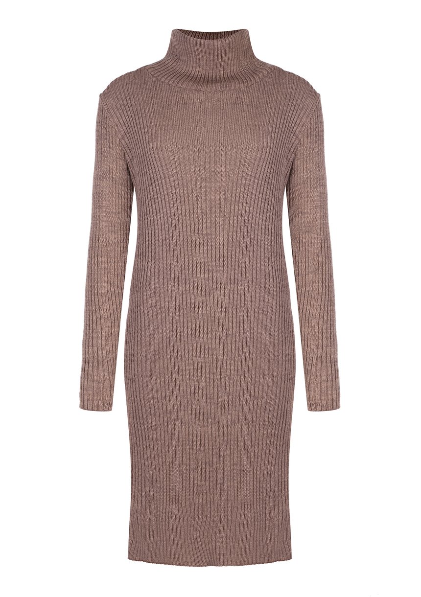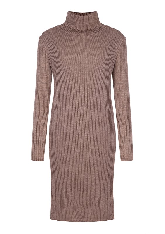 Ciepła sukienka dzianinowa w uniwersalnym odcieniu latte. Przyjemnie otuli Cię luźnym krojem i wygodnym golfem. Idealna na co dzień, jako element lekkiej i kobiecej stylizacji.
