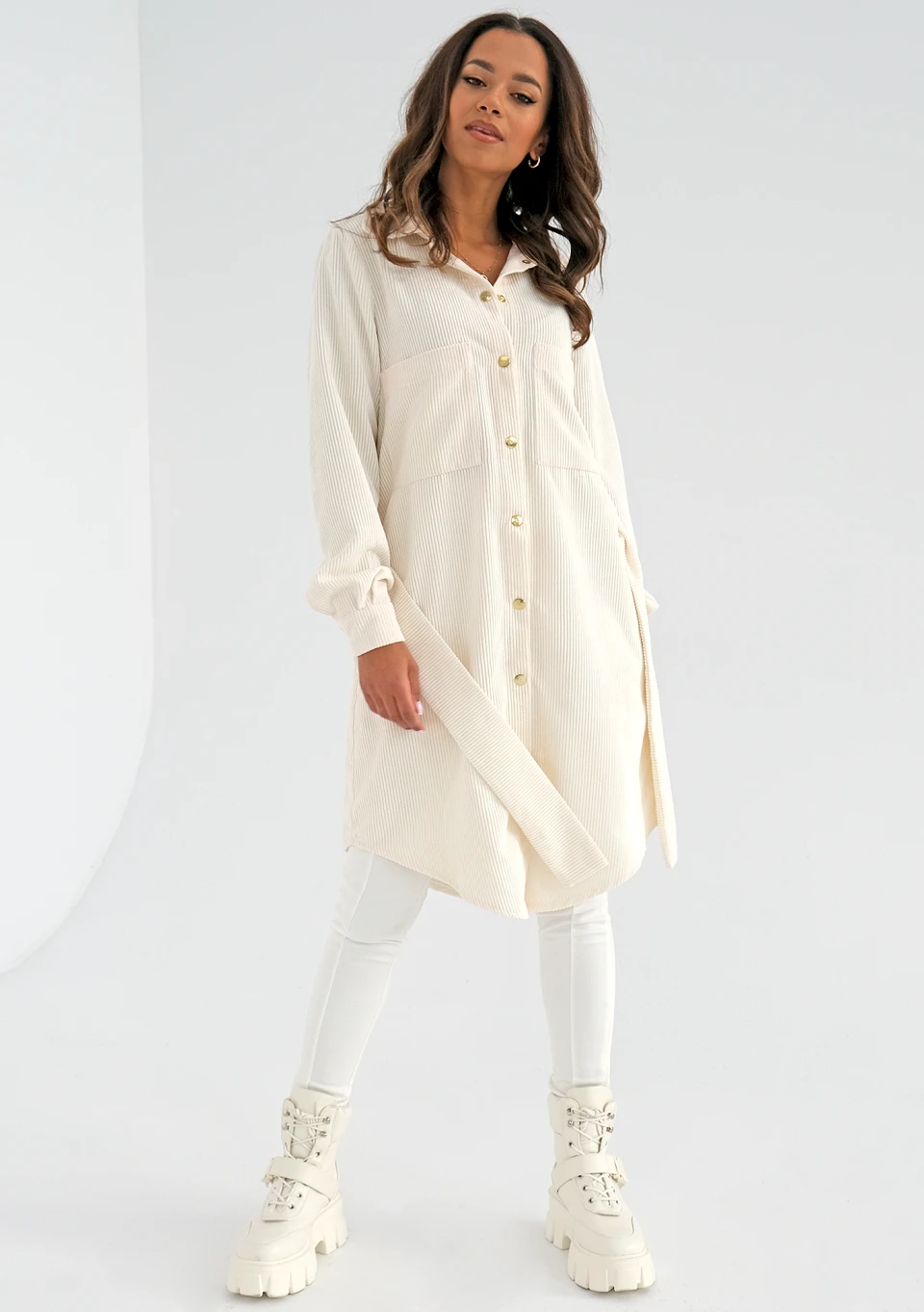 Modna sukienka koszulowa ze sztruksu w kolorze waniliowym. Niezwykle stylowy i wygodny fason, który możesz nosić luźno lub przewiązany paskiem.