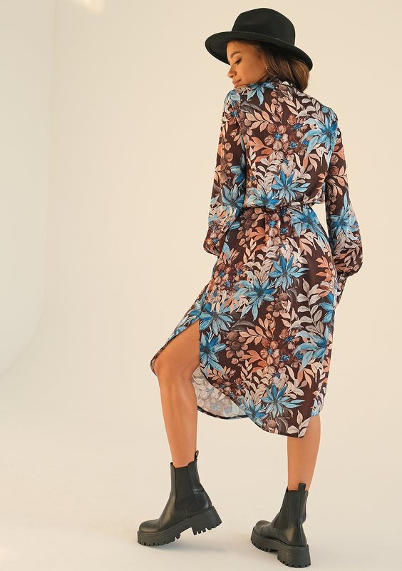 Lekka sukienka midi ze zwiewnej tkaniny o koszulowym kroju. Brązowy model w niebieskie kwiaty, elegancko ozdobiony wiązanym kołnierzykiem.