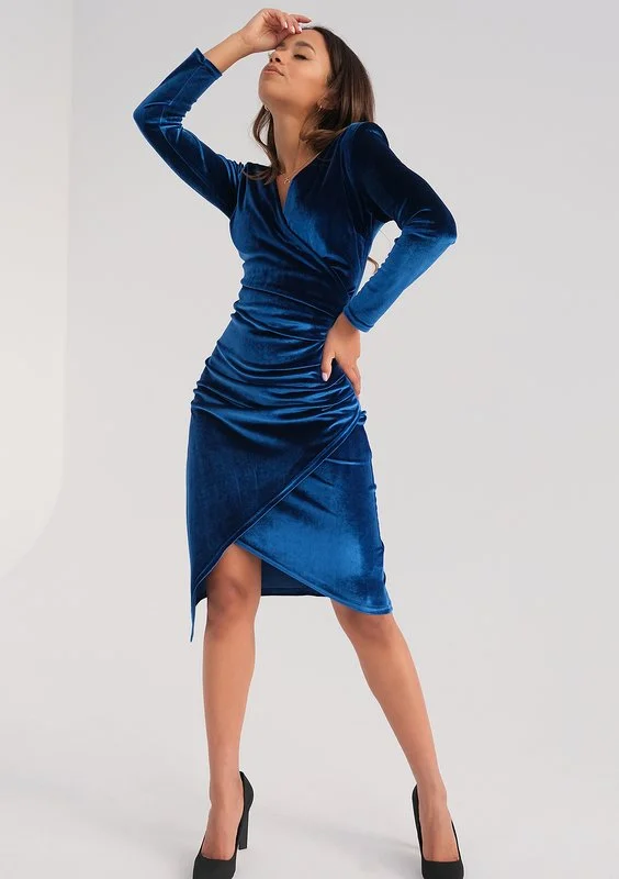 Szykowna sukienka midi z kopertowym dekoltem i długimi rękawami. Zniewala dopasowanym fasonem i elegancką, aksamitną fakturą. Wspaniale wyeksponuje atuty i podkreśli kształty kobiecej sylwetki.
