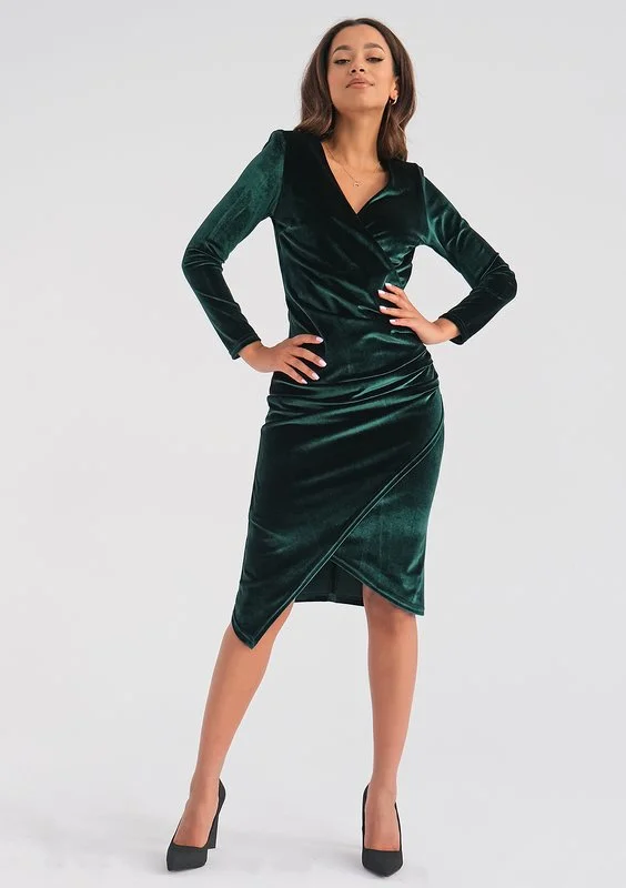Elegancka sukienka midi o kopertowym, dopasowanym kroju. Oczaruje Cię elegancką fakturą lśniącej tkaniny i głębią koloru. Idealnie podkreśli Twoją figurę i zada szyku przy wielu ważnych okazjach.
