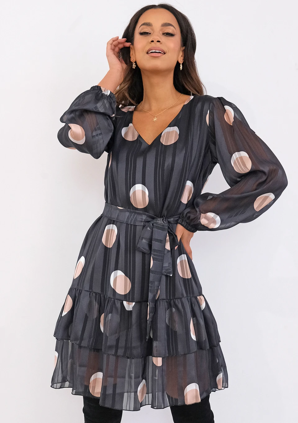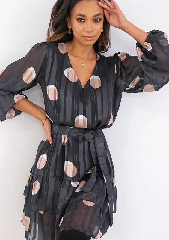 Ta koktajlowa sukienka mini zada Ci szyku przy wielu okazjach! Finezyjne falbanki, szyfonowe wykończenie i deseń grochów przepleciony srebrzystą nicią budują wyjątkowo elegancki, ale i niepowtarzalny styl.