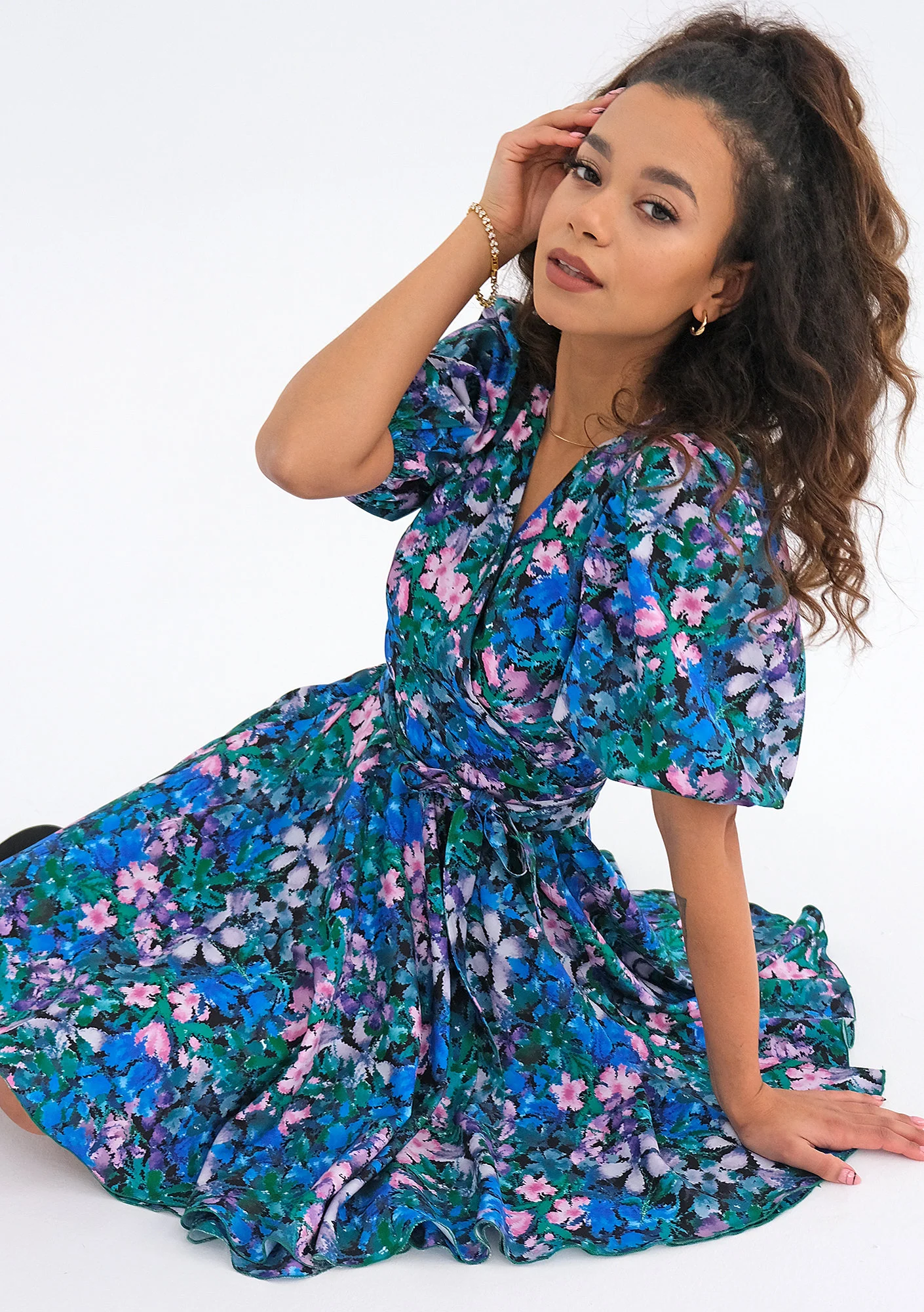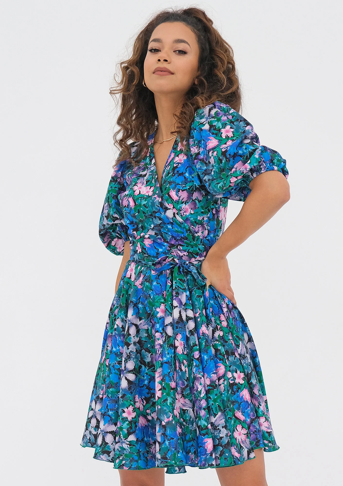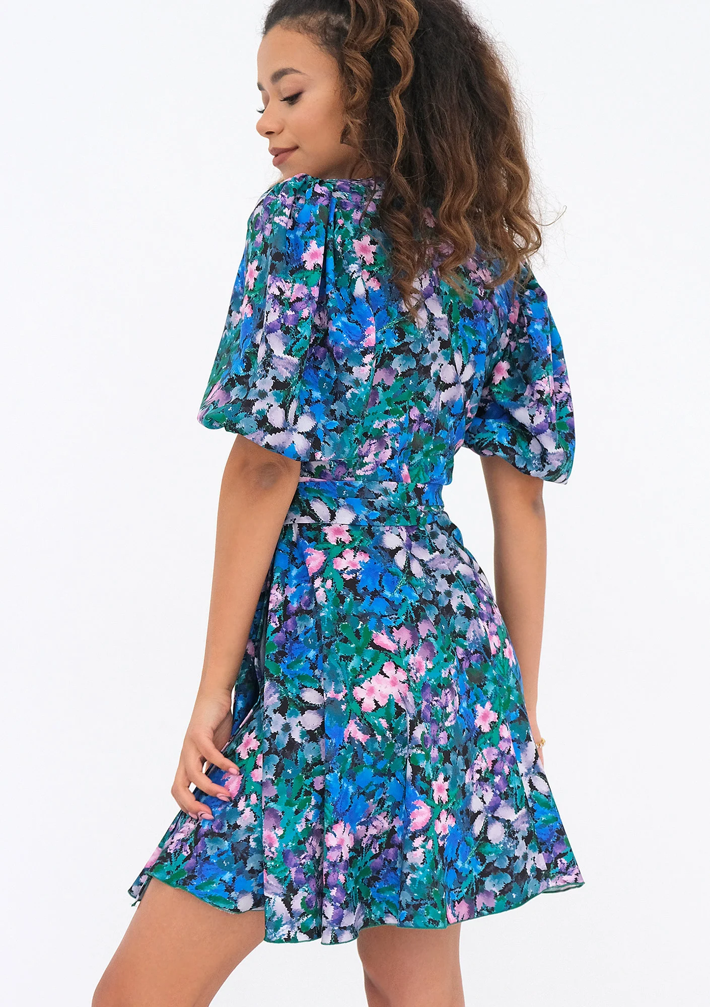 Fason mini, rozkloszowany, z kopertowym dekoltem i wiązaniem w talii, z krótkimi, bufiastymi rękawami.