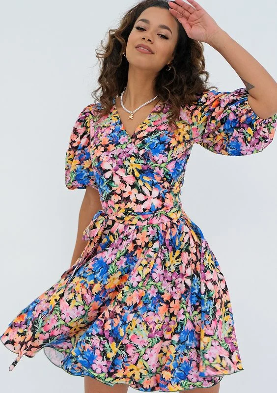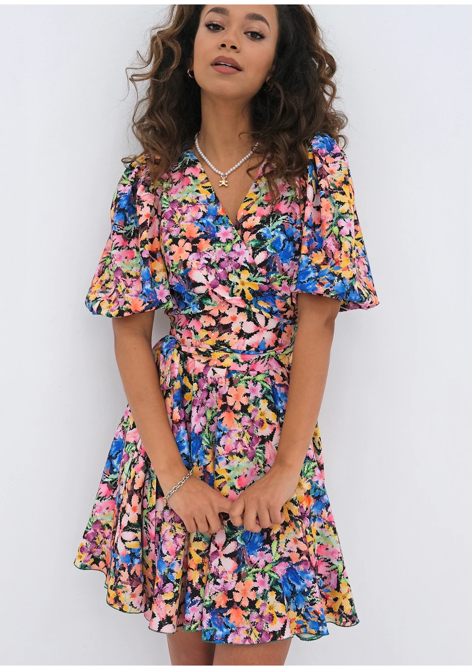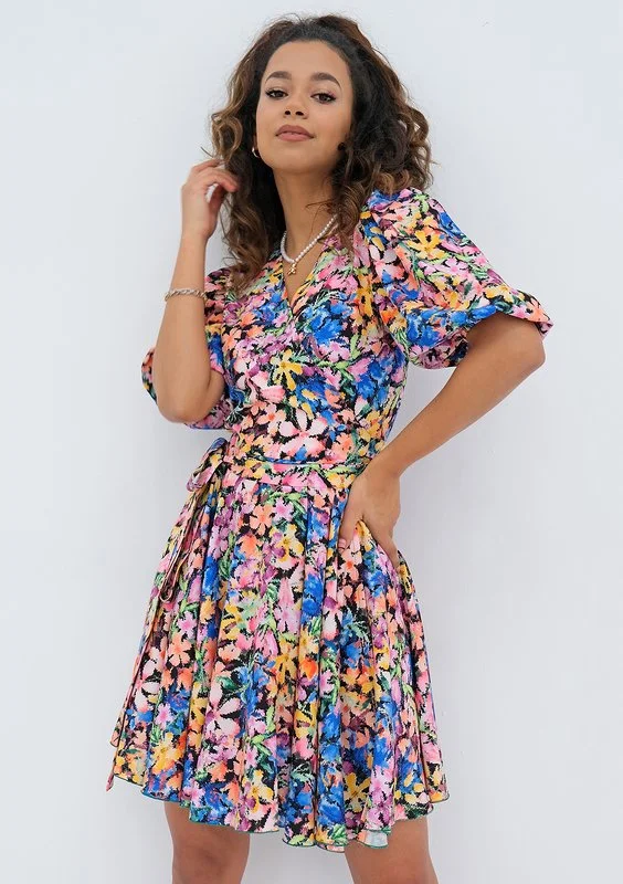Cornelia to kwiecista, rozkloszowana sukienka mini w bardzo romantycznym stylu. Dodaje wdzięku kopertowym dekoltem, bufkami rękawów i dopasowanym w talii fasonem. Niezwykle kobieca kreacja na codzienne i szczególne okazje.