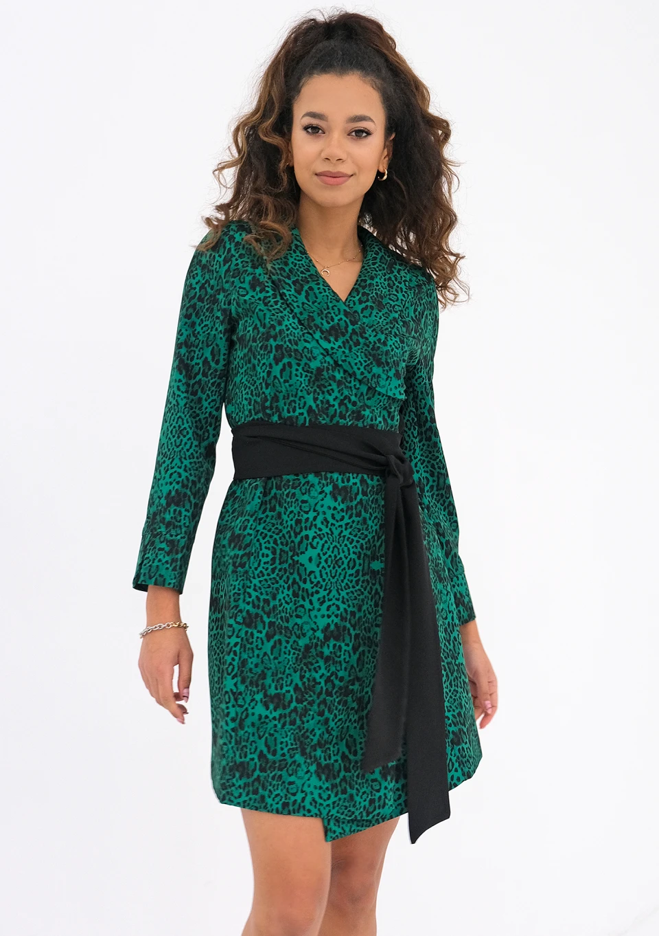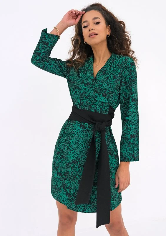 Odkryj urok charakternych cętek, w eleganckiej, kopertowej formule. Zielona sukienka o zmysłowej długości mini podkreśli Twoje atuty efektownym wiązaniem i dopasowaną formą. Rita to model na codzienne okazje, jak i ważne uroczystości.