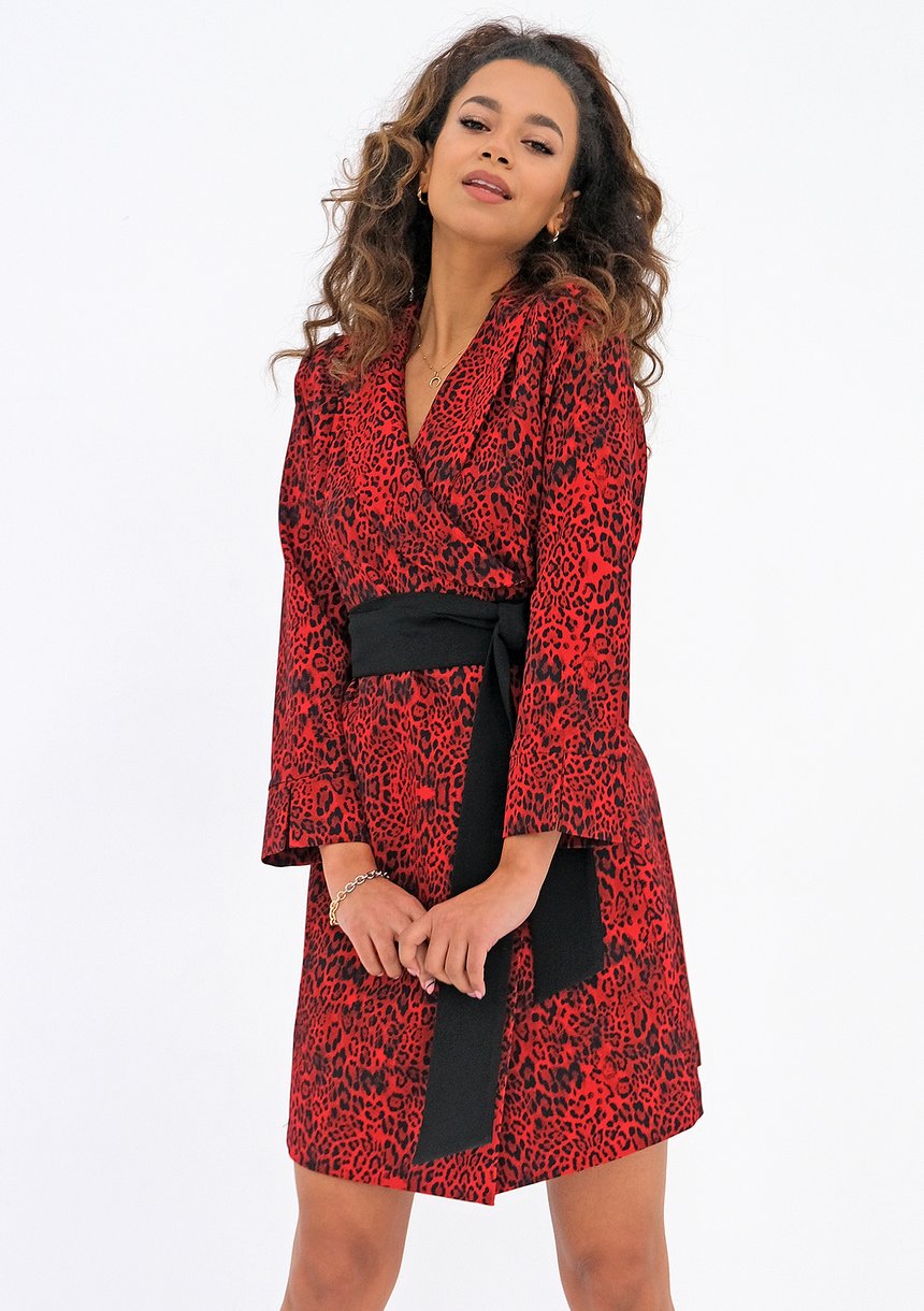 Czerwona sukienka mini o kopertowym, wiązanym w talii fasonie. To wyjątkowa kreacja z pazurem, w ponadczasowy deseń cętek. Idealna na co dzień, jak i wyjątkowe okazje.