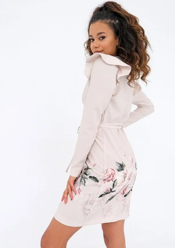 Eteryczna sukienka mini w delikatnej oprawie kwiatowego wzoru. Ozdobiona falbankami przy ramionach, wiązana w talii cienkim sznureczkiem. Pełna wdzięku i finezji, zada szyku podczas wyjątkowych uroczystości, jak i na co dzień.
