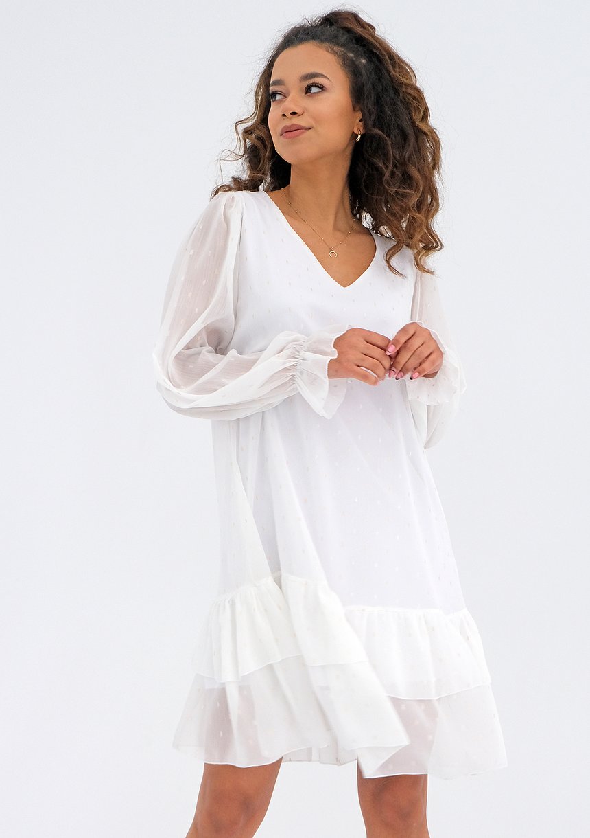 Eteryczna sukienka mini w anielskiej bieli ecru. To niezwykle delikatny model ze zwiewnej tkaniny, wykończony rękawami i falbankami z półprzezroczystego szyfonu. Pełna wdzięku i gracji, zada szyku przy wielu okazjach.
