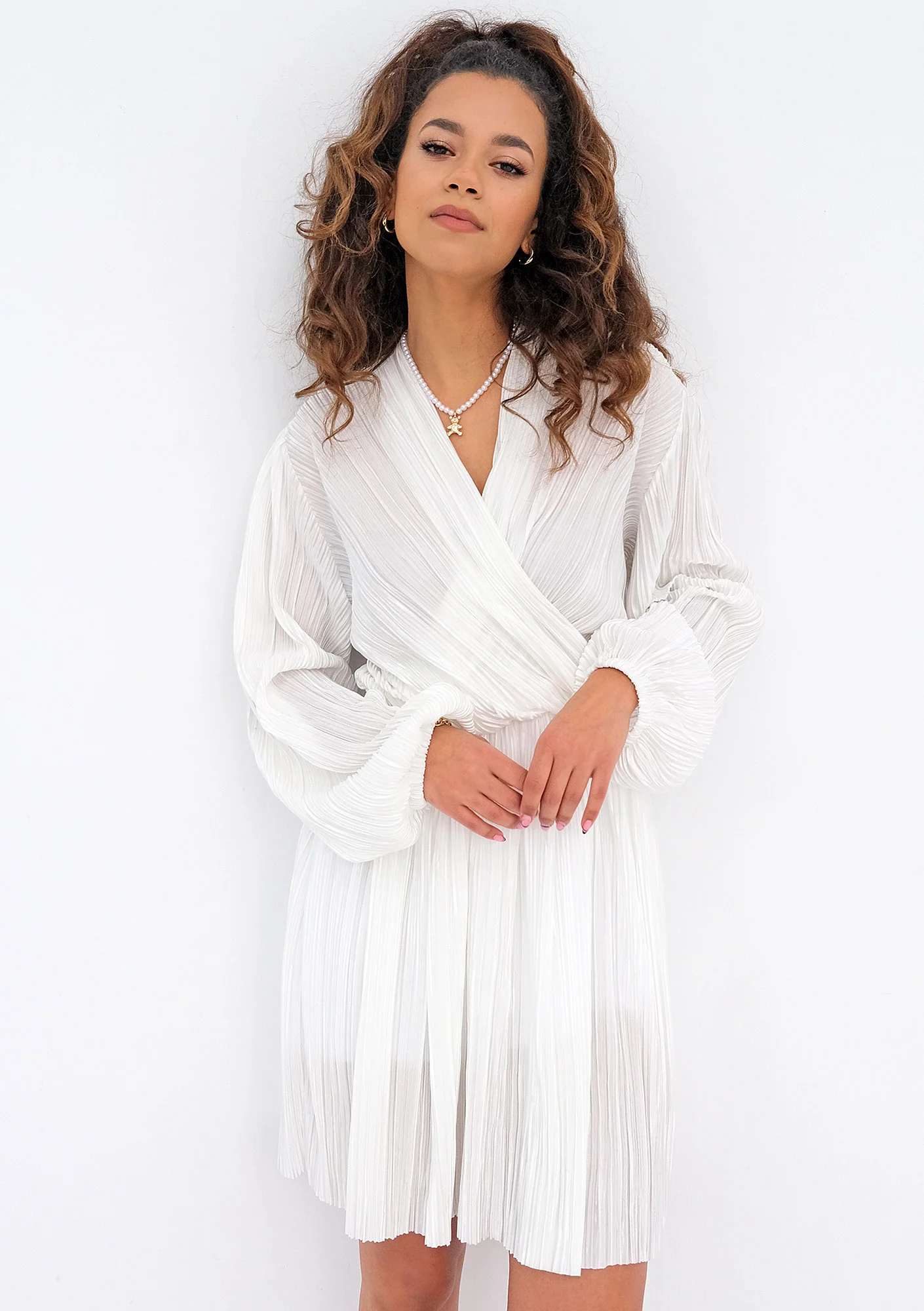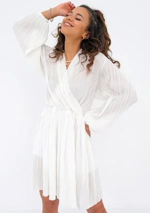 Fason mini, rozkloszowany, z kopertowym, półprzezroczystym dekoltem i długimi rękawami z drobnymi gumkami. Sukienka posiada elastyczną gumkę w talii.