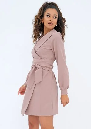 Do zalet tej beżowej sukienki mini należy elegancki, kopertowy fason wiązany w talii. Prezentuje się niezwykle kobieco, ponieważ podkreśla wcięcie i zarysowuje proporcje zbliżone do klepsydry. Szykownego stylu nadają zapinane na wygodne napy mankiety i długi, marynarkowy kołnierz. Sukienka jest wykonana z eleganckiej tkaniny, której rzadki splot zapewnia komfortowy przepływ powietrza. Kreacja jest łatwa w pielęgnacji, więc posłuży przez wiele sezonów. Jej klasyczny, jednokolorowy styl to ponadczasowa propozycja, zawsze aktualna pod kątem modowym. Nasze kopertowe sukienki koktajlowe o tym fasonie występują w różnych kolorach, w zakresie rozmiarów XS – L.