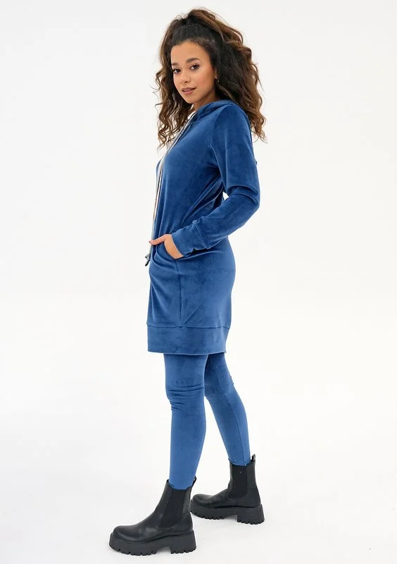 Sportowa sukienka z miłego w dotyku materiału z delikatnym lśnieniem aksamitnej faktury. Model oczarowuje barwną kompozycją kaptura i troczków, a także wygodnym fasonem z dwoma kieszonkami.