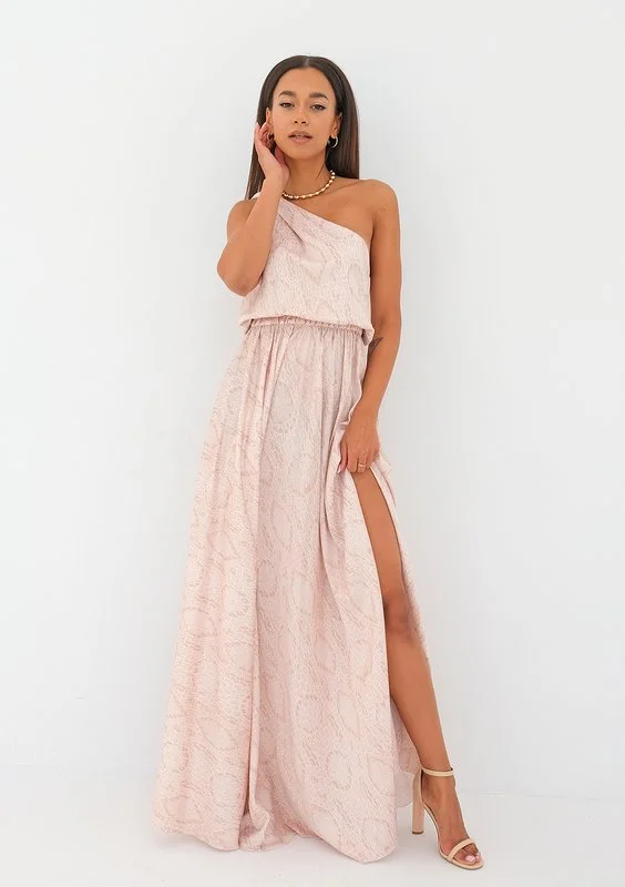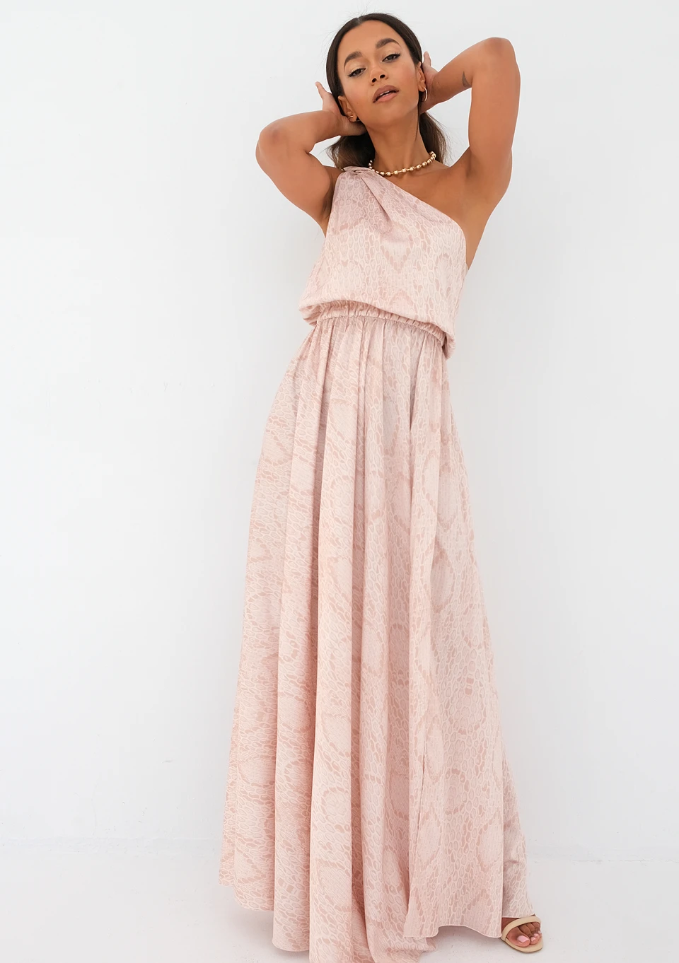 Zjawiskowa sukienka maxi o wytwornym, asymetrycznym kroju eksponującym ramię zawiniętym ramiączkiem. Model z gładkiej satyny, z delikatnym, beżowym wzorem i elastyczną gumką w talii.