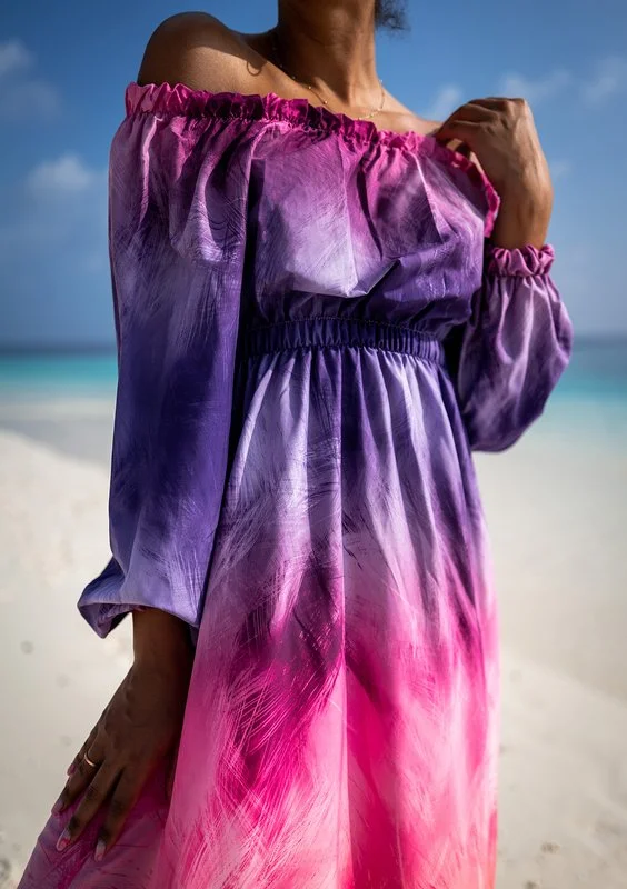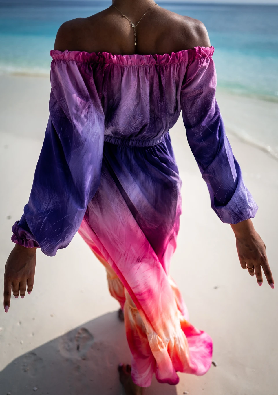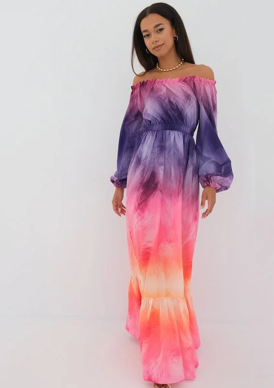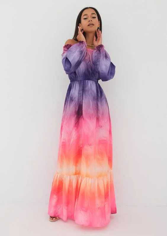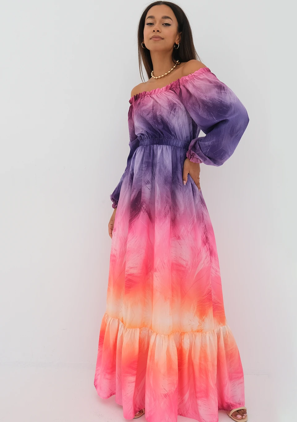 Letnia sukienka maxi ze zmysłową ekspozycją ramion. Zdobi ją wielobarwny wzór ombre z dominującym różem i fioletem. Sukienka ma luźny fason z długim rękawem i przeszyciem tworzącym falbanę.