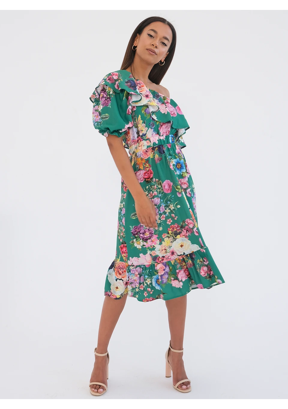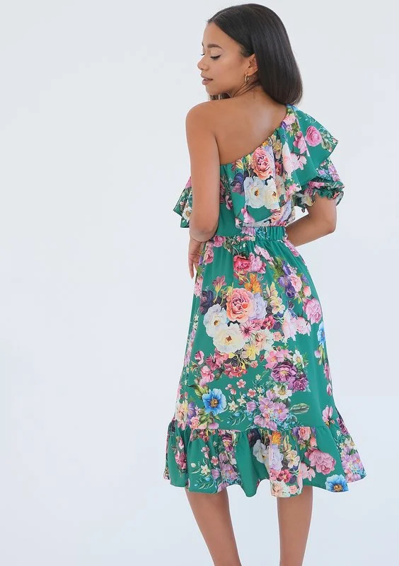 Koktajlowa sukienka midi w zielonym kolorze. Ponętnie odsłania jedno ramię, a jej romantyczny styl tworzą falbany i bogaty, kwiecisty wzór. To zjawiskowa, niezwykle kobieca propozycja na szczególne, jak i codzienne okazje.