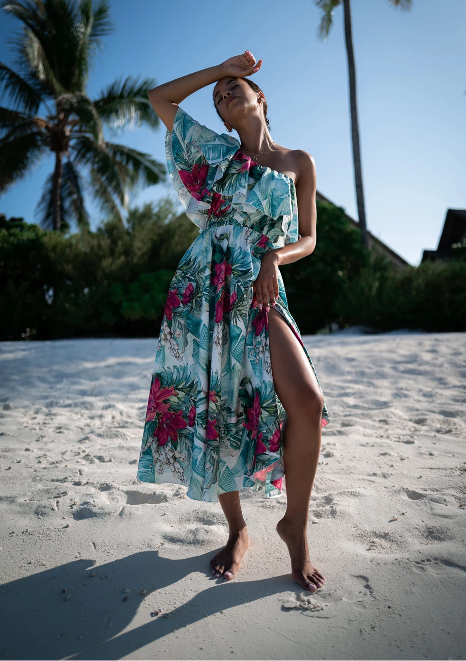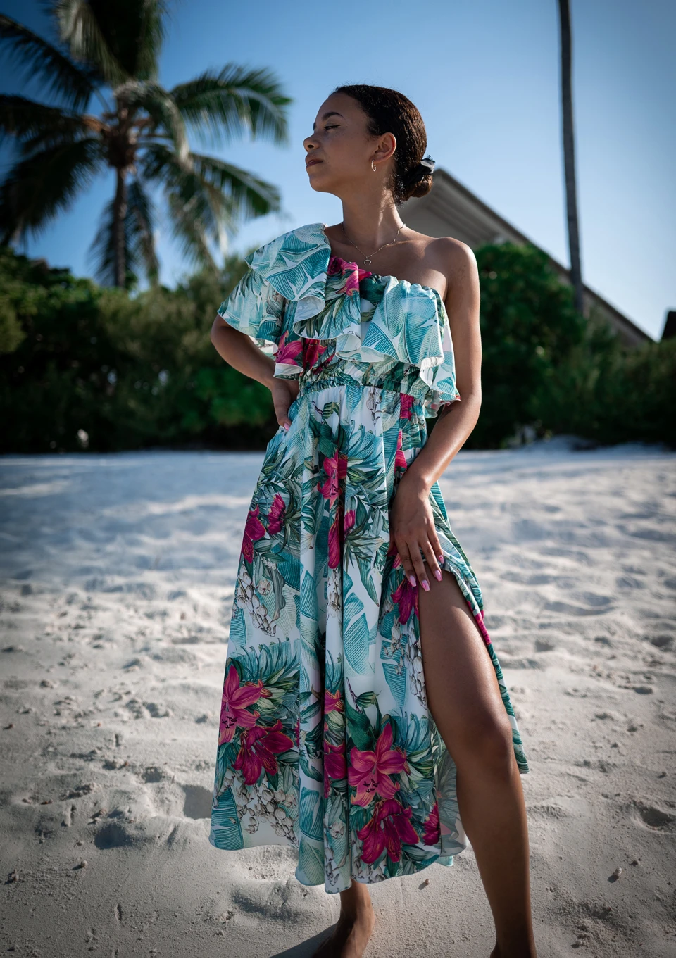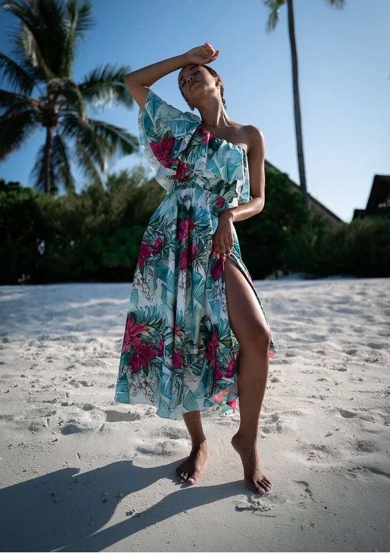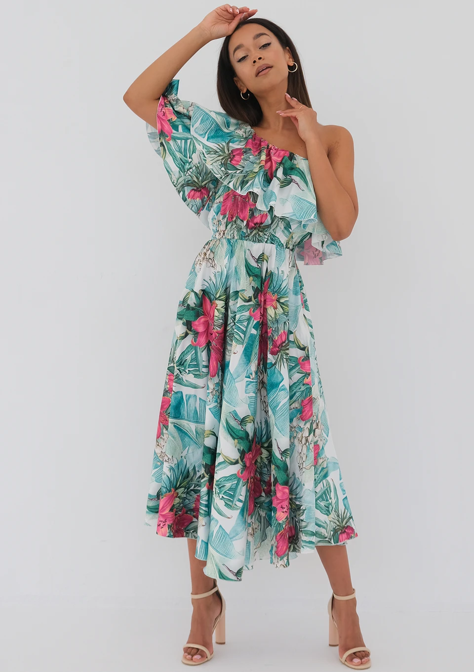 Jules to propozycja bogatego wzoru liści i kwiatów w oprawie eleganckiej, błyszczącej satyny. Efektowny fason łączy zmysłową asymetrię dekoltu z falbanką i falowanym rękawkiem. To sukienka midi, która dzięki licznym zdobieniom stanowi doskonałą kreację na wyjątkowe okazje.