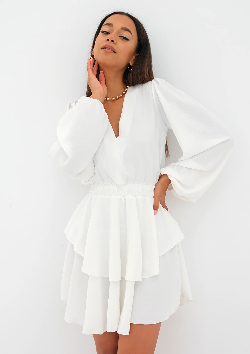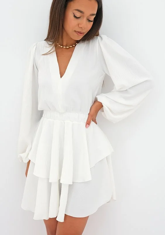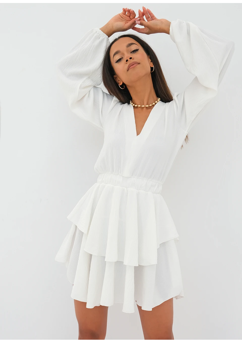 Delikatna sukienka mini z długim rękawem, ozdobiona falbankami. Wykonana w klasycznej bieli ecru, wszechstronna pod kątem okazji i doboru dodatków.