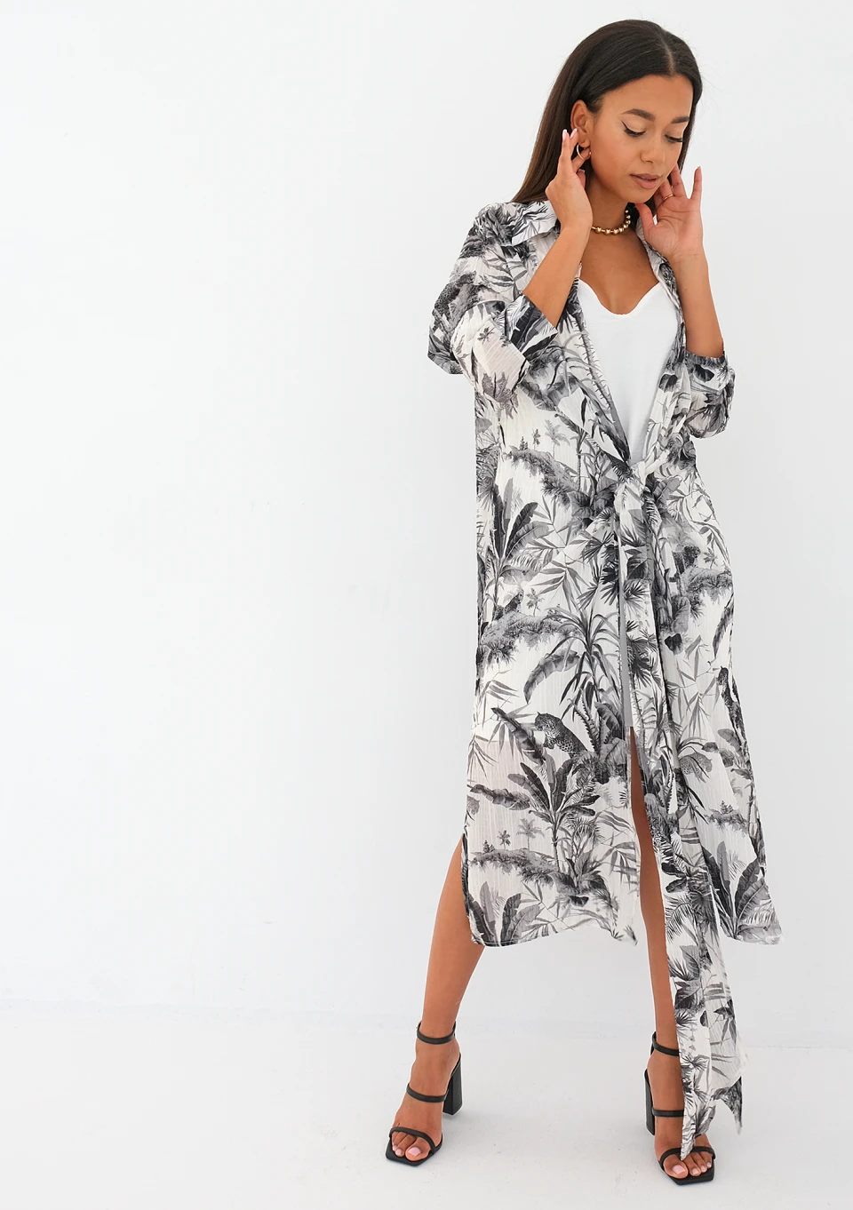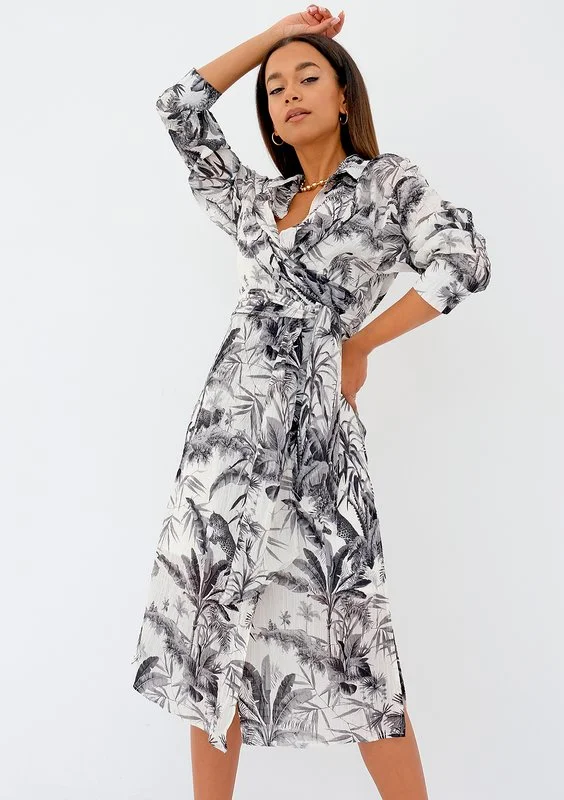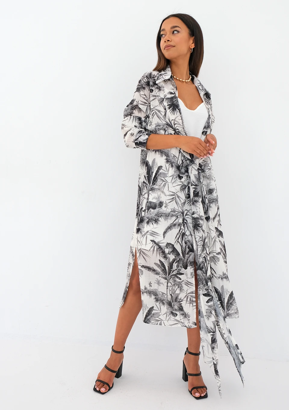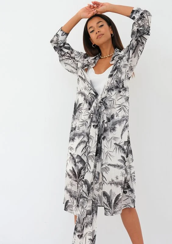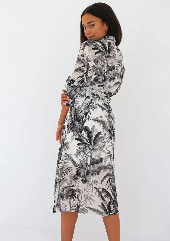 Zwiewna sukienka koszulowa z długim wiązaniem w talii, którą można nosić luźno lub kopertowo. Fason składa się z białej warstwy mini i wzorzystej, wierzchniej midi. Zdobiona czarnym deseniem palm, idealnie lekka na lato.
