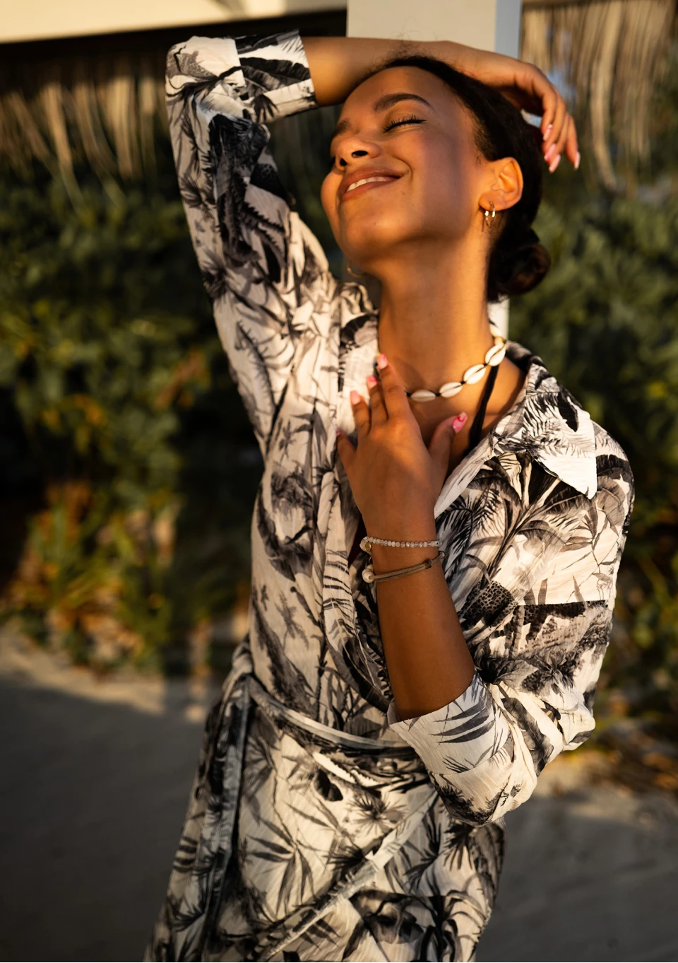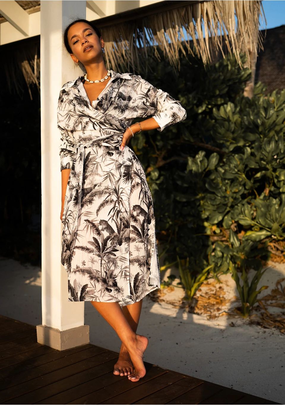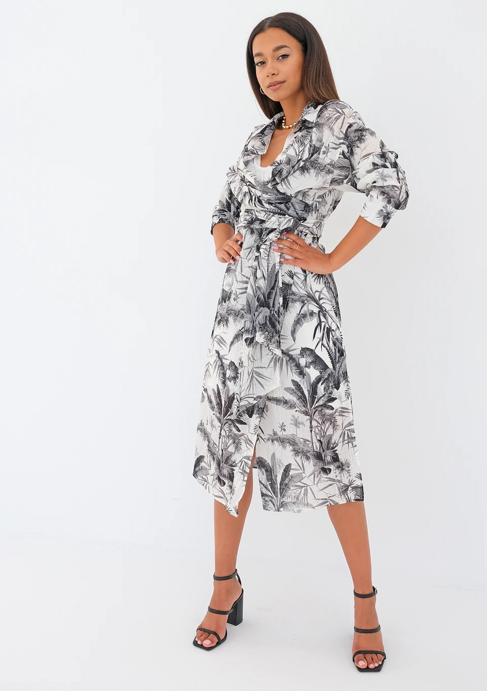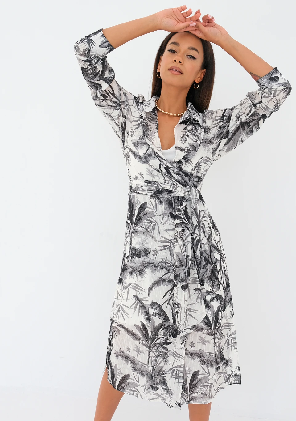 Zwiewna sukienka koszulowa z długim wiązaniem w talii, którą można nosić luźno lub kopertowo. Fason składa się z białej warstwy mini i wzorzystej, wierzchniej midi. Zdobiona czarnym deseniem palm, idealnie lekka na lato.