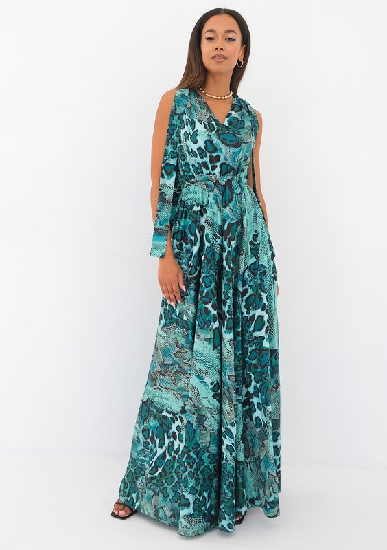Zwiewna sukienka maxi o zaskakującej kompozycji zwierzęcego motywu i morskich odcieni zieleni. To letnia kreacja wykonana z eleganckiej, błyszczącej satyny. Idealna na spacer promenadą, jak i letnie przyjęcie weselne.