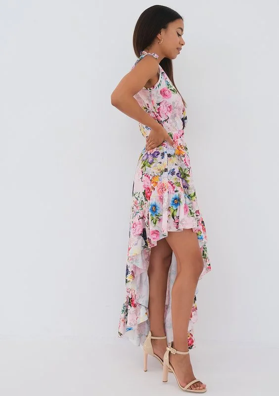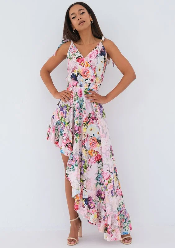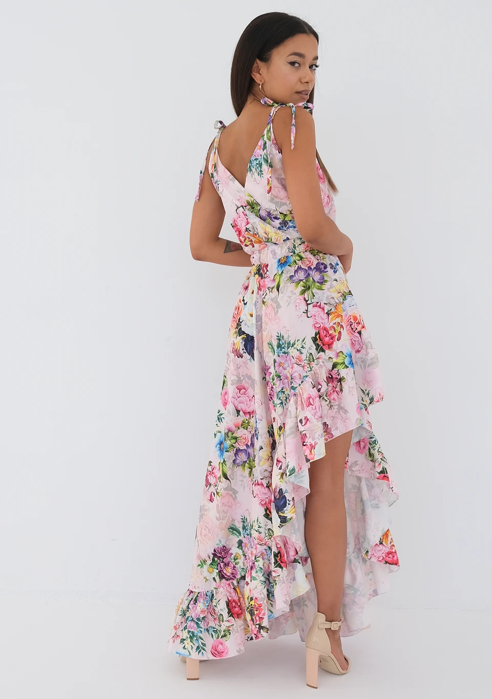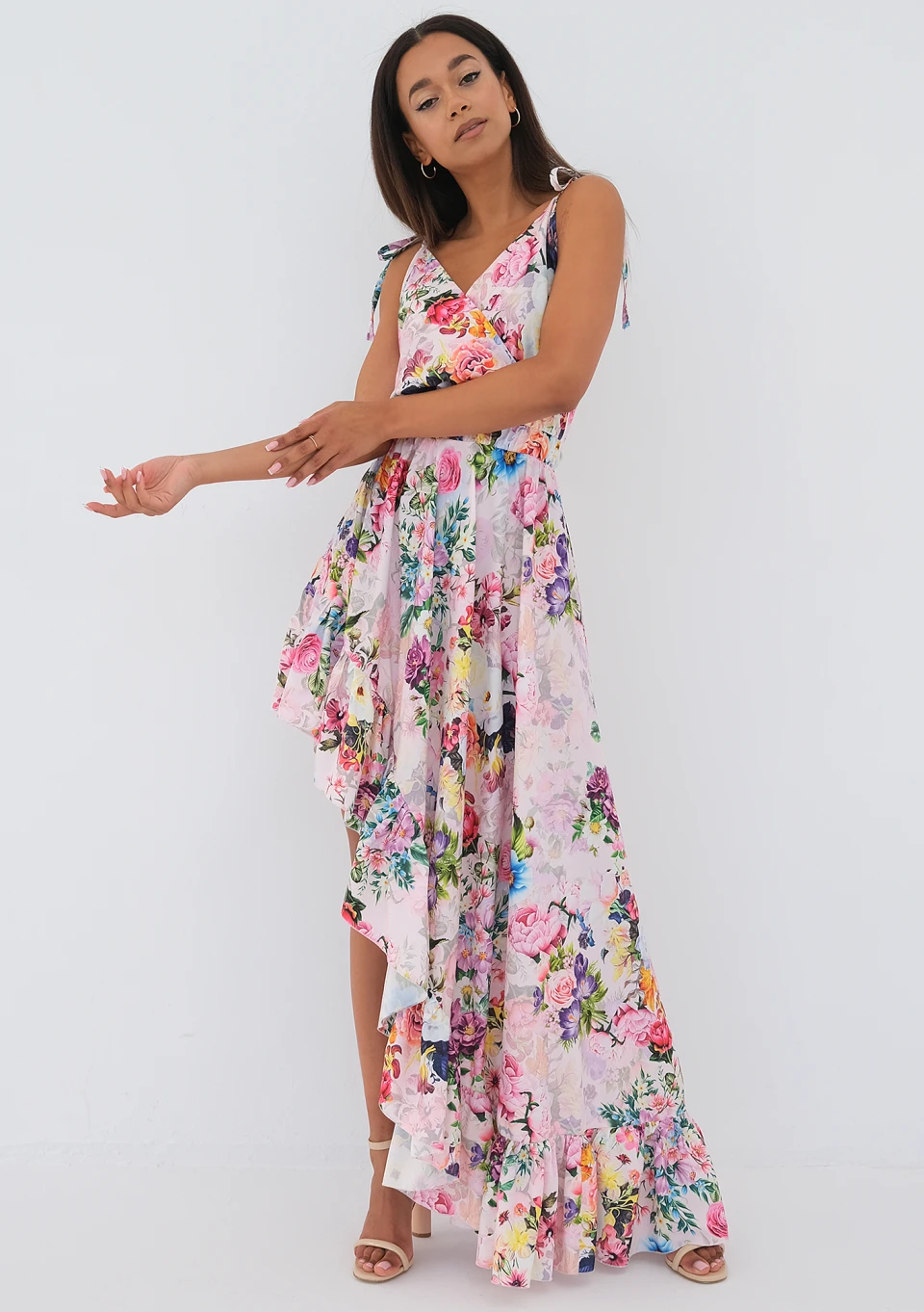 Długa sukienka z asymetrią, wykonana z gładkiej tkaniny, ozdobiona falbanami w hiszpańskim stylu. Niezwykle zjawiskowa, prezentuje wielokolorowy, kwiecisty wzór na różowym tle. Model z wiązanymi ramiączkami i elastyczną gumką w talii.